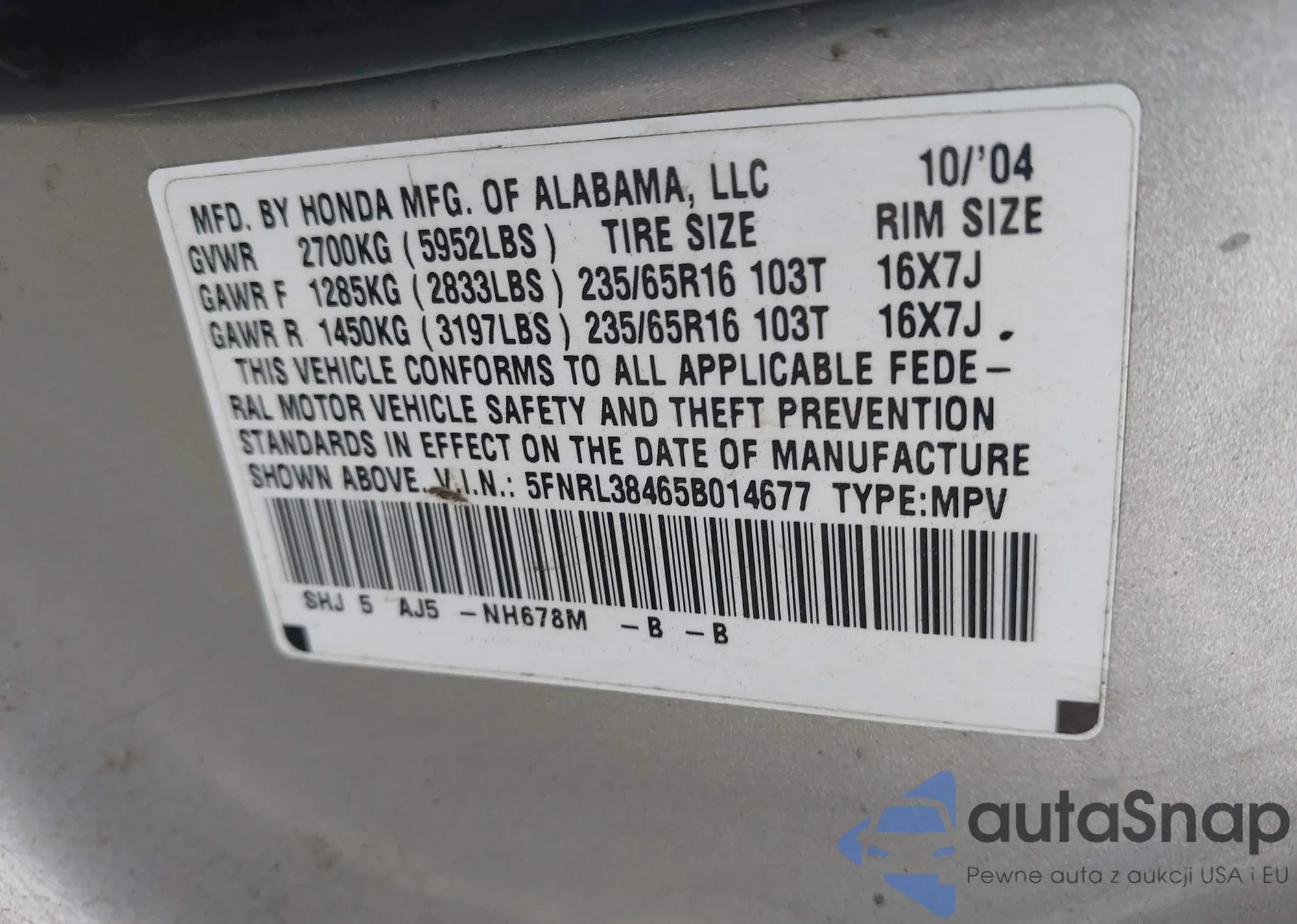 • VIN 5FNRL38465B014677