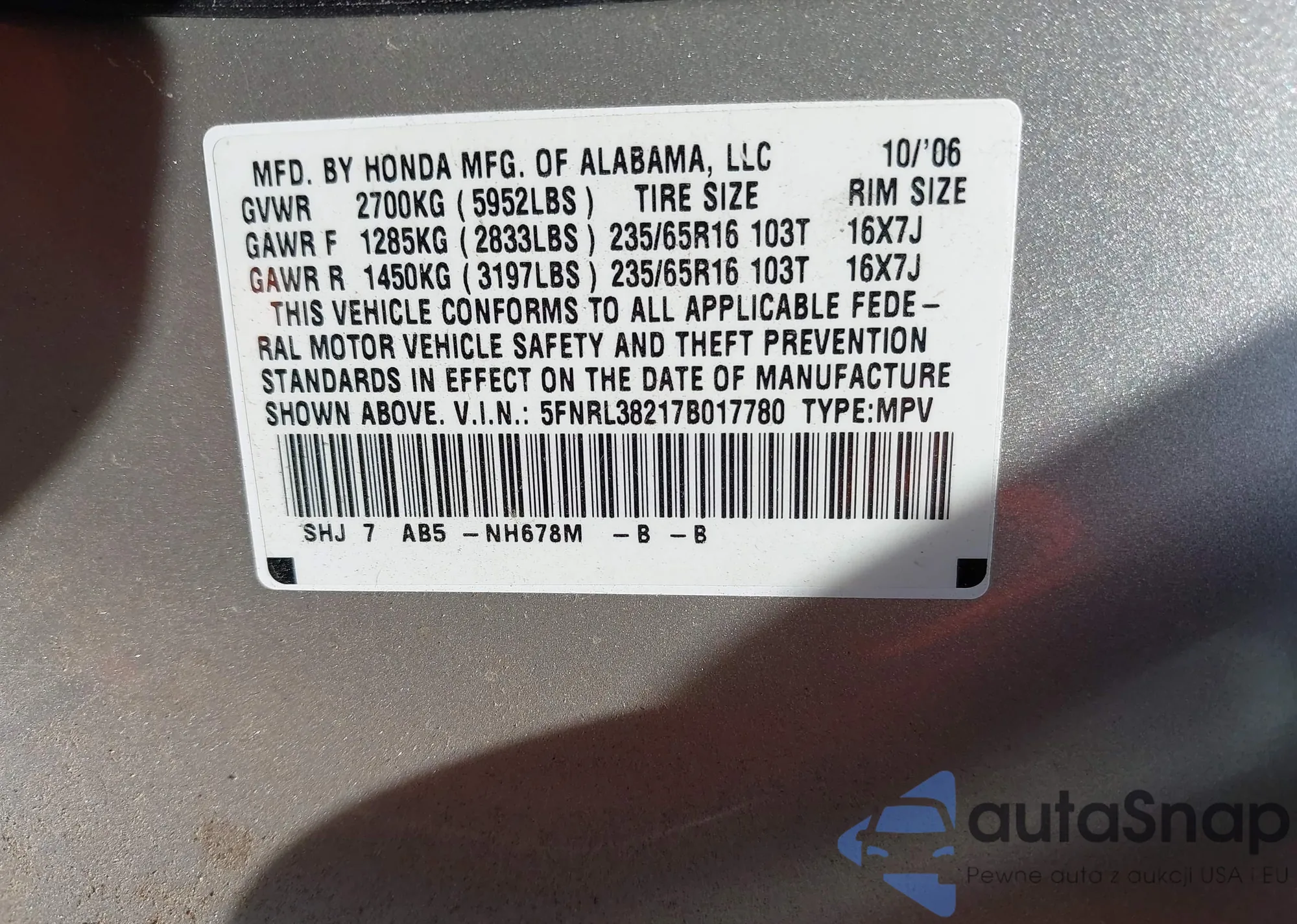 • VIN 5FNRL38217B017780