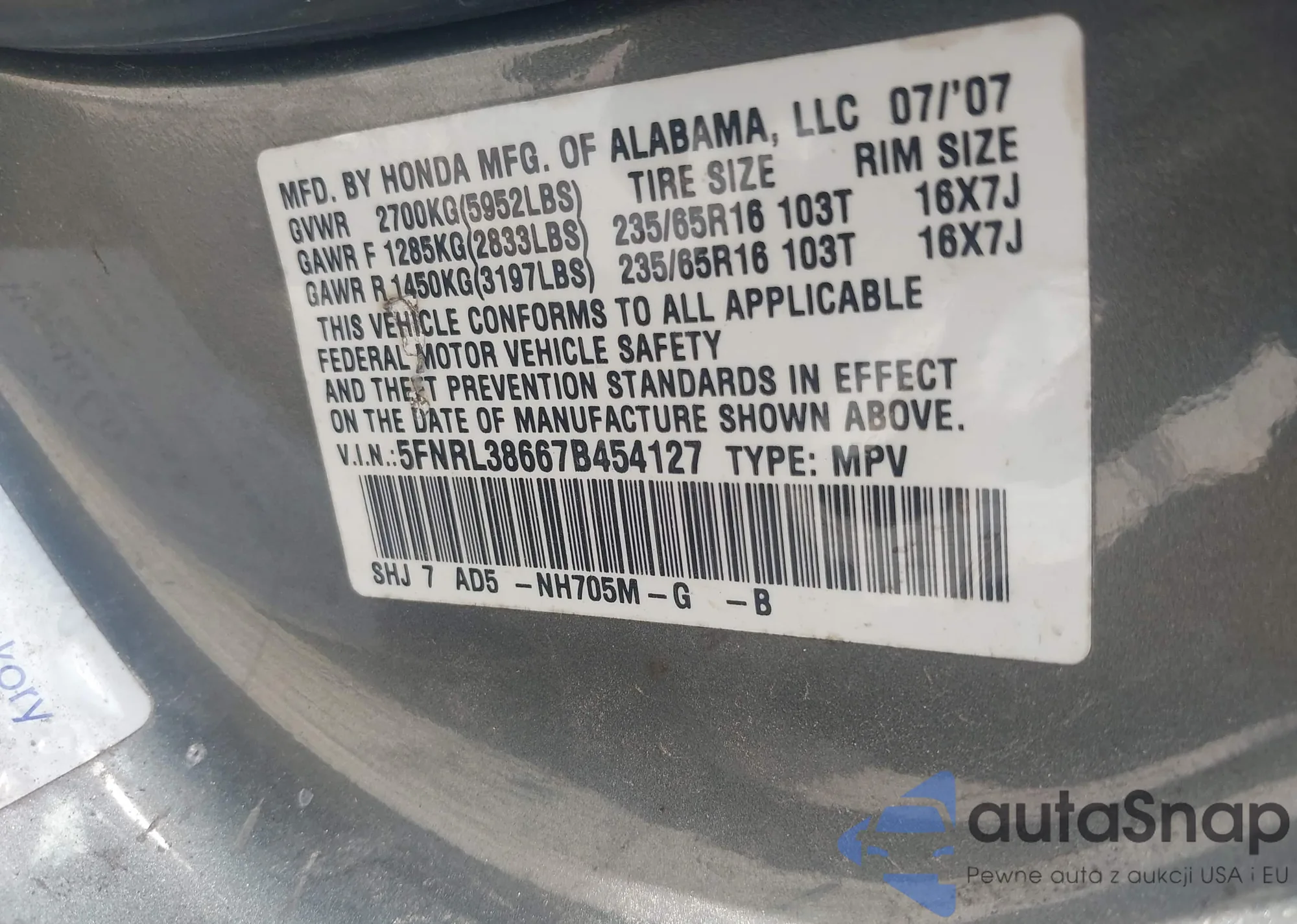 • VIN 5FNRL38667B454127