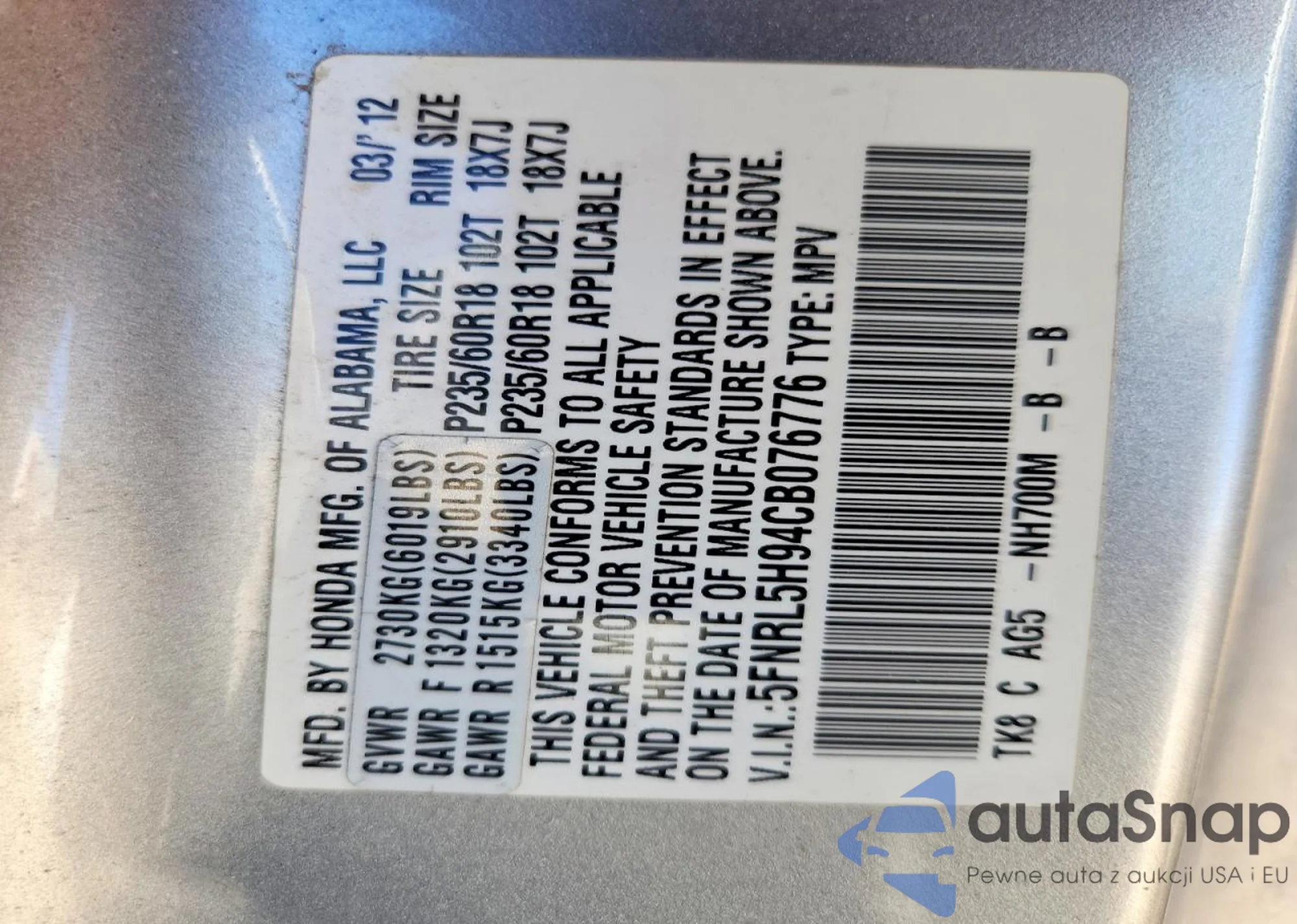 • VIN 5FNRL5H94CB076776