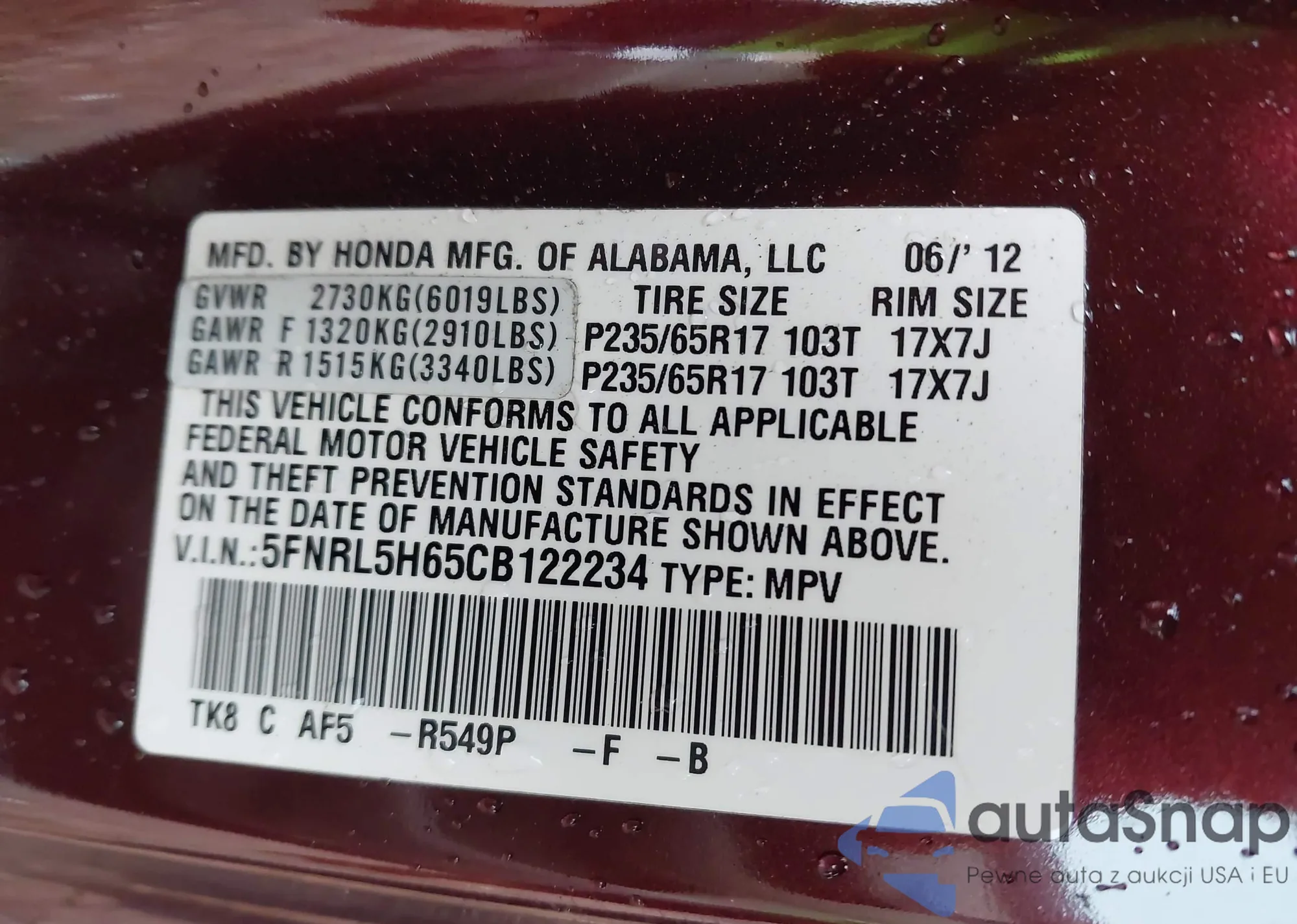 • VIN 5FNRL5H65CB122234