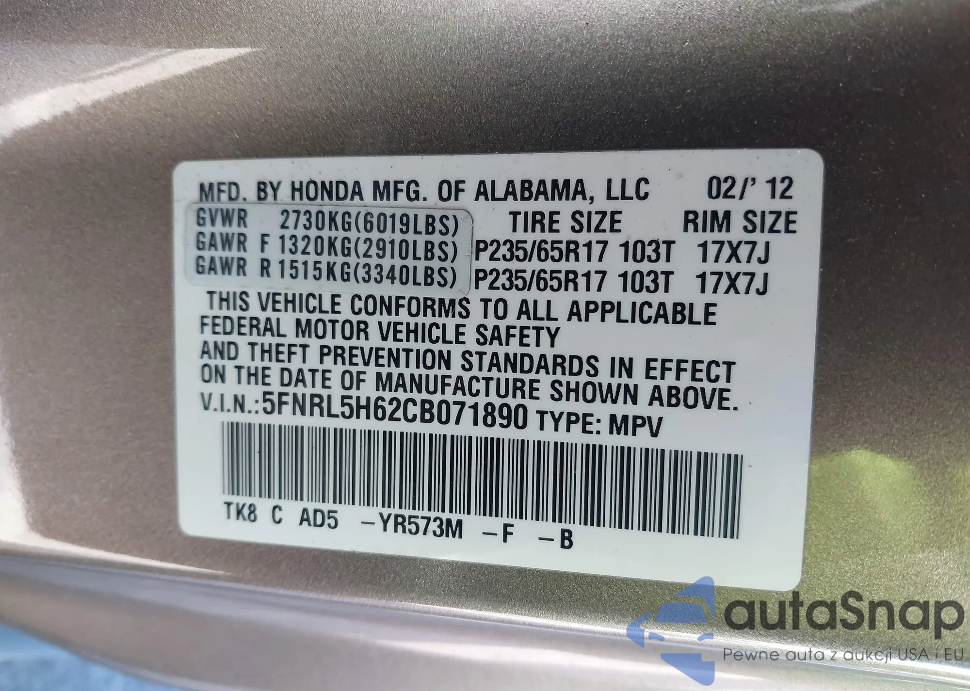 • VIN 5FNRL5H62CB071890