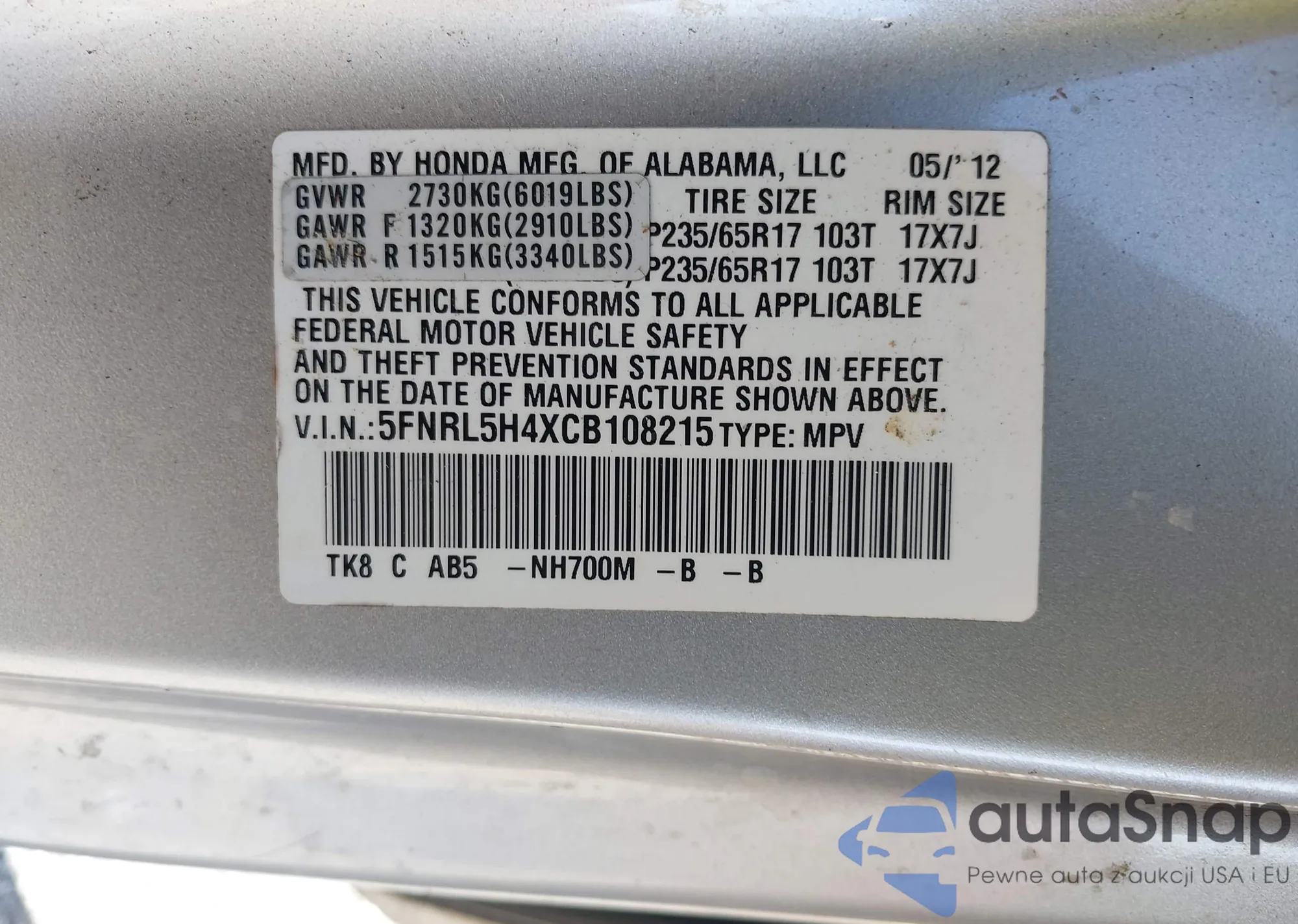 • VIN 5FNRL5H4XCB108215