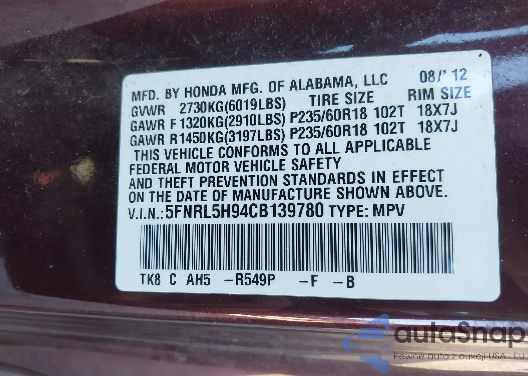 • VIN 5FNRL5H9XCB107917