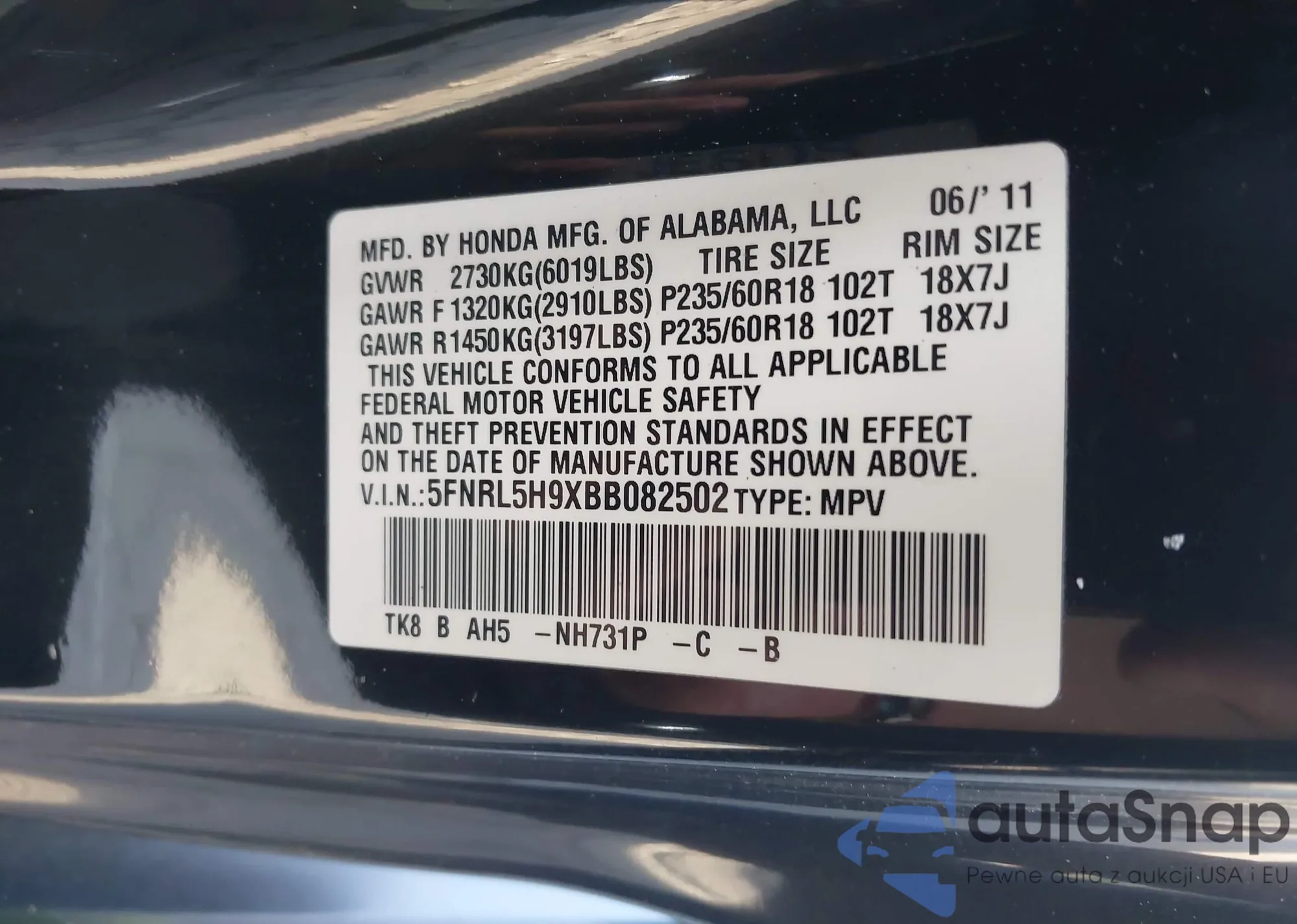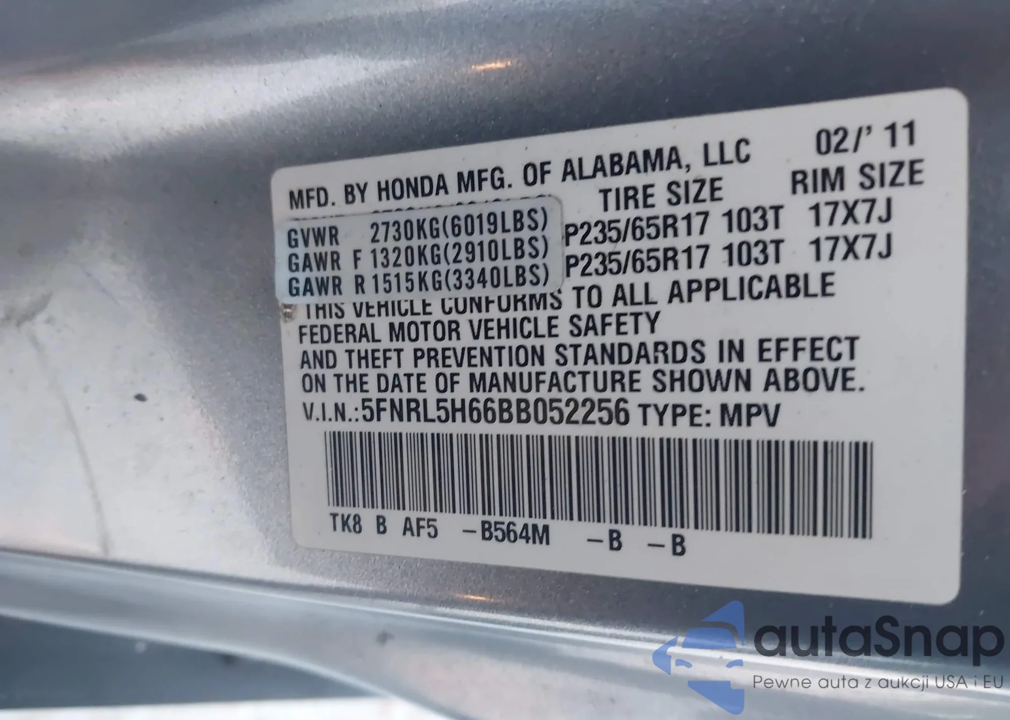 • VIN 5FNRL5H60BB006714