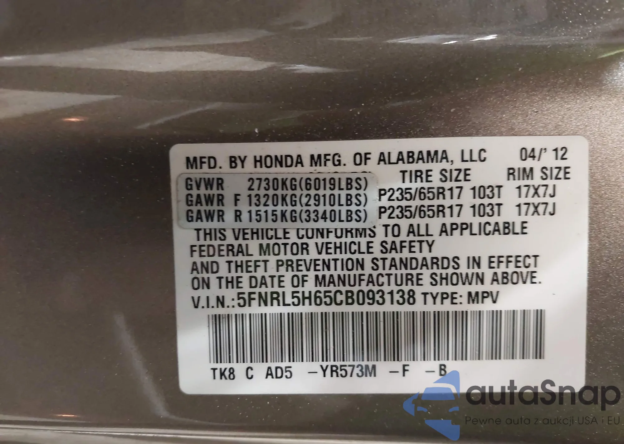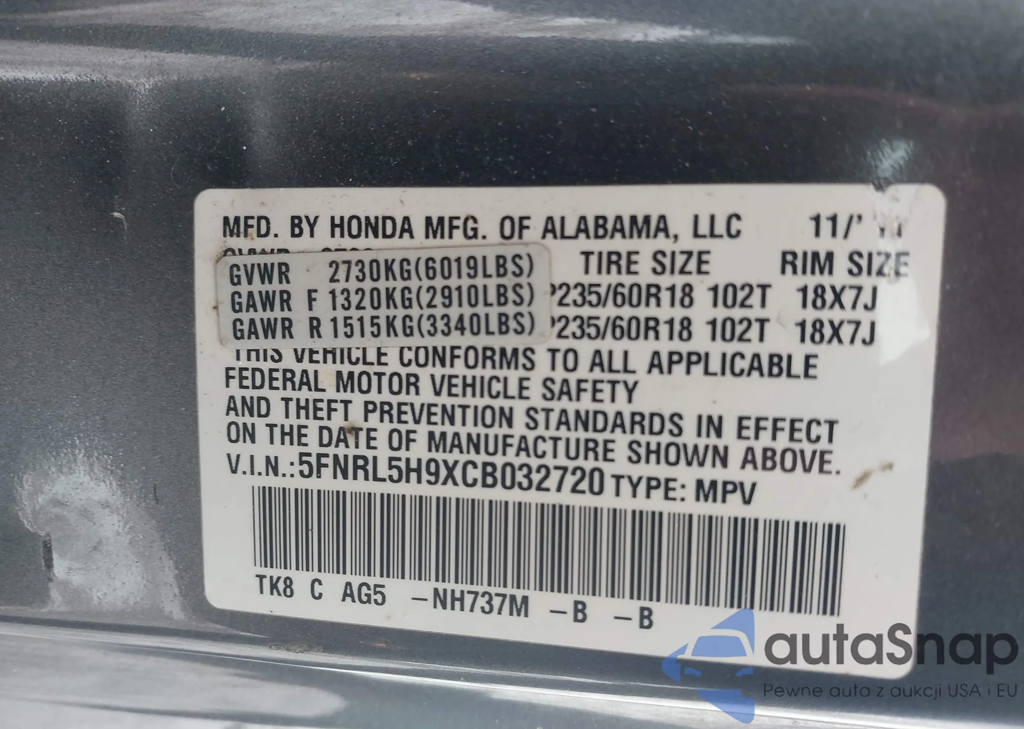 • VIN 5FNRL5H9XCB032720