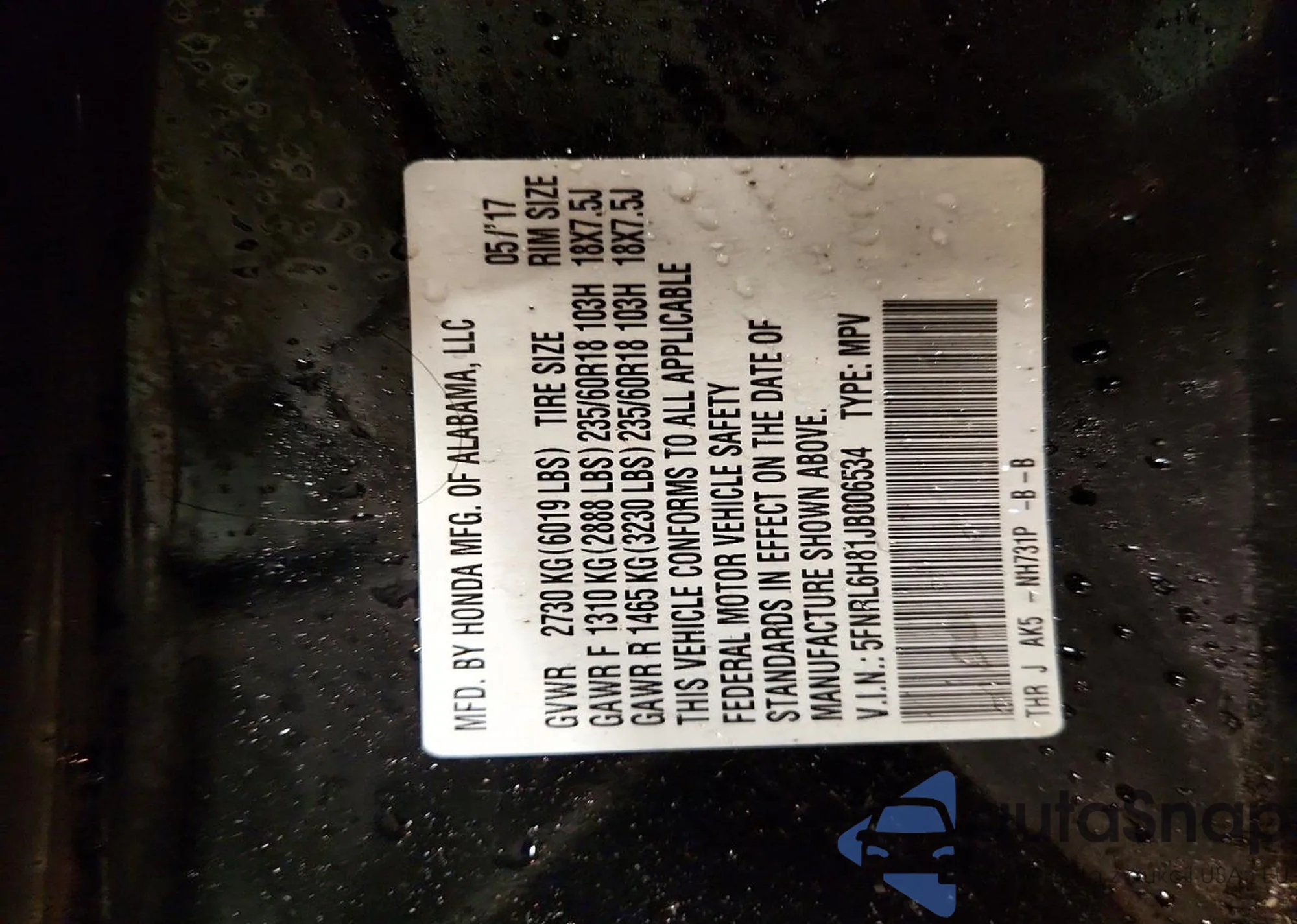 • VIN 5FNRL6H81JB006534
