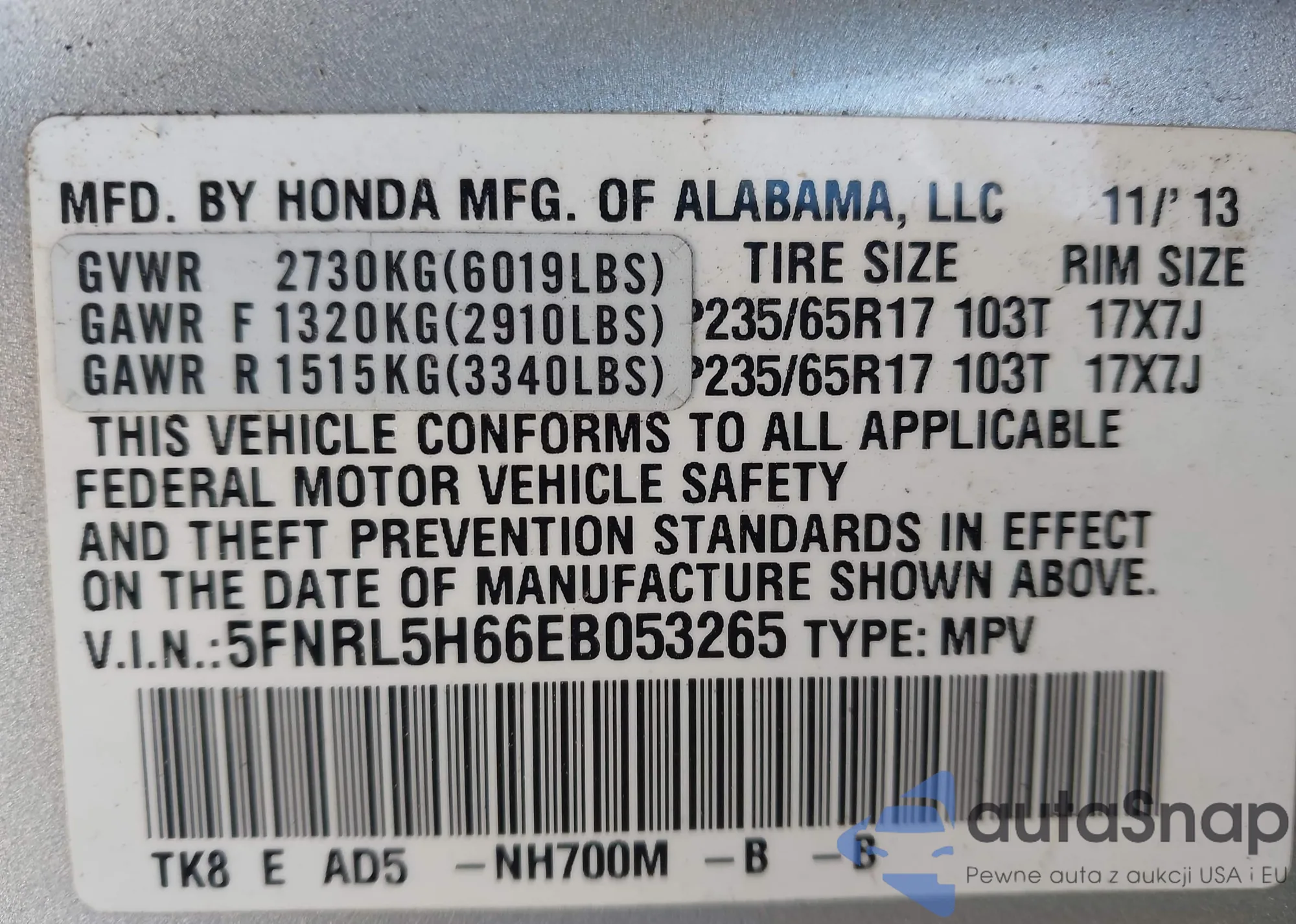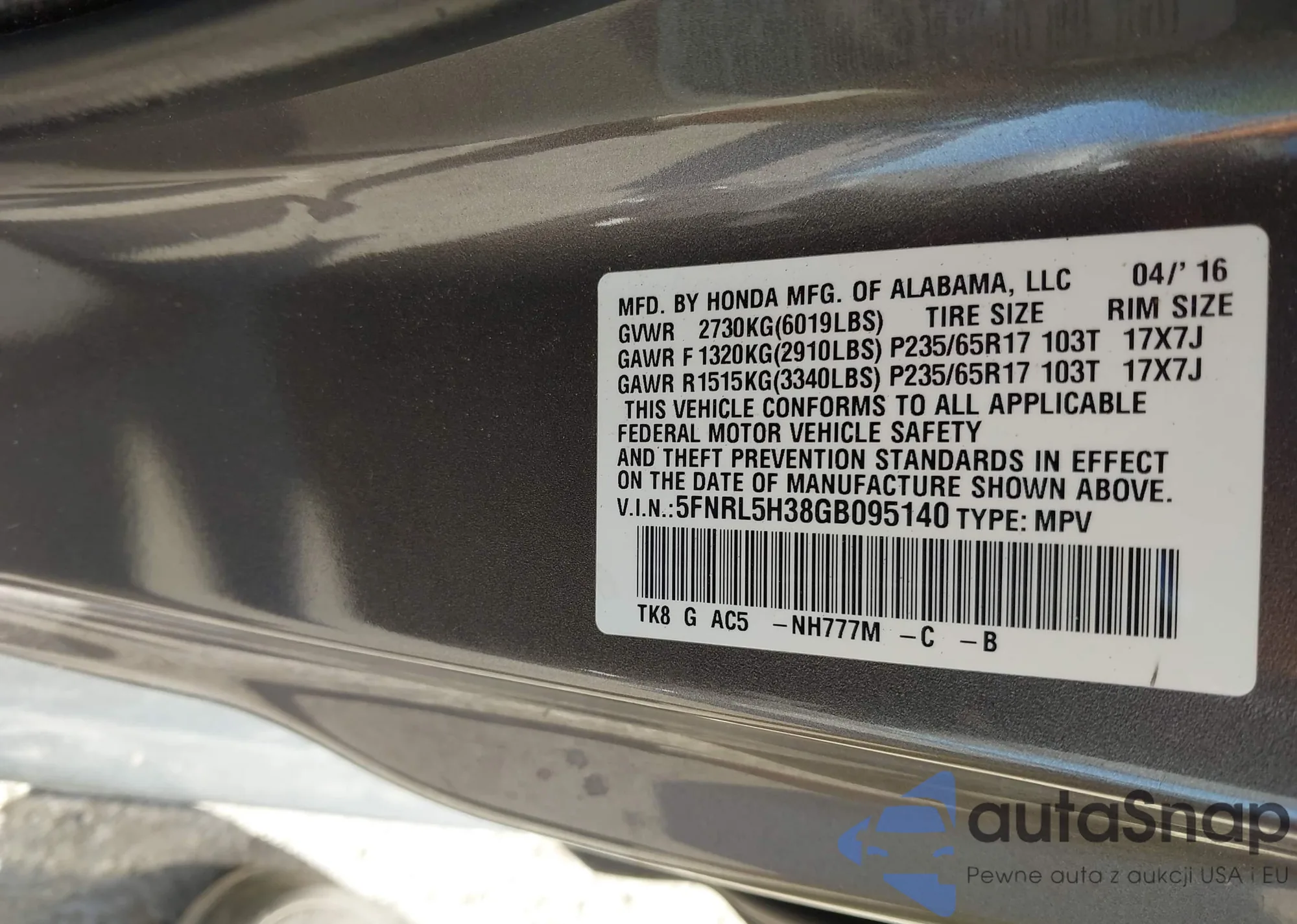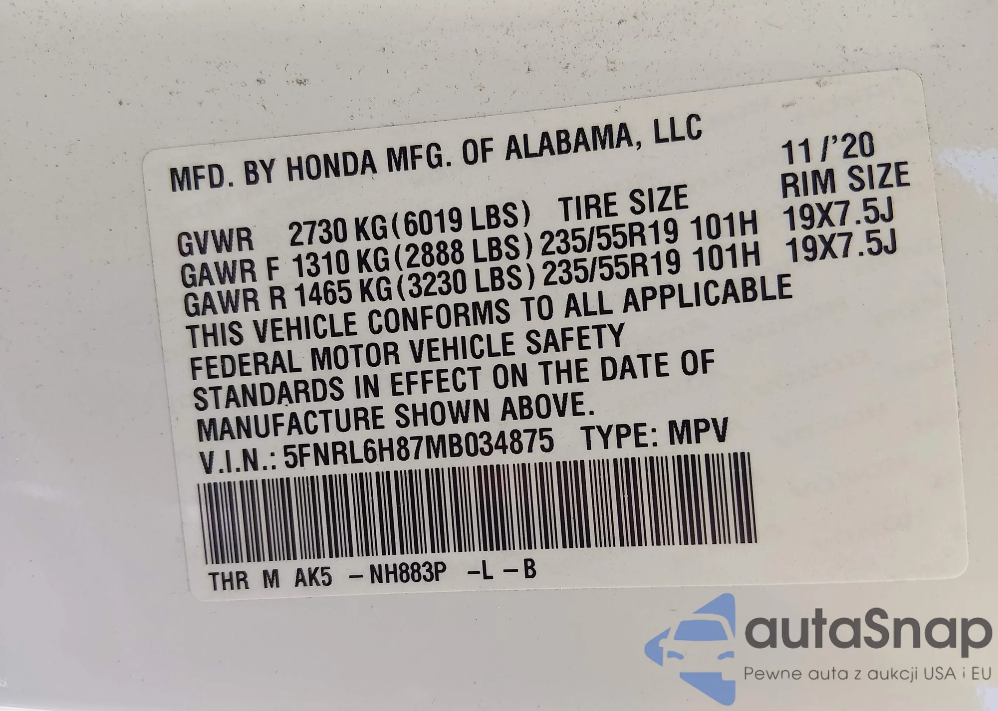 • VIN 5FNRL6H87MB034875