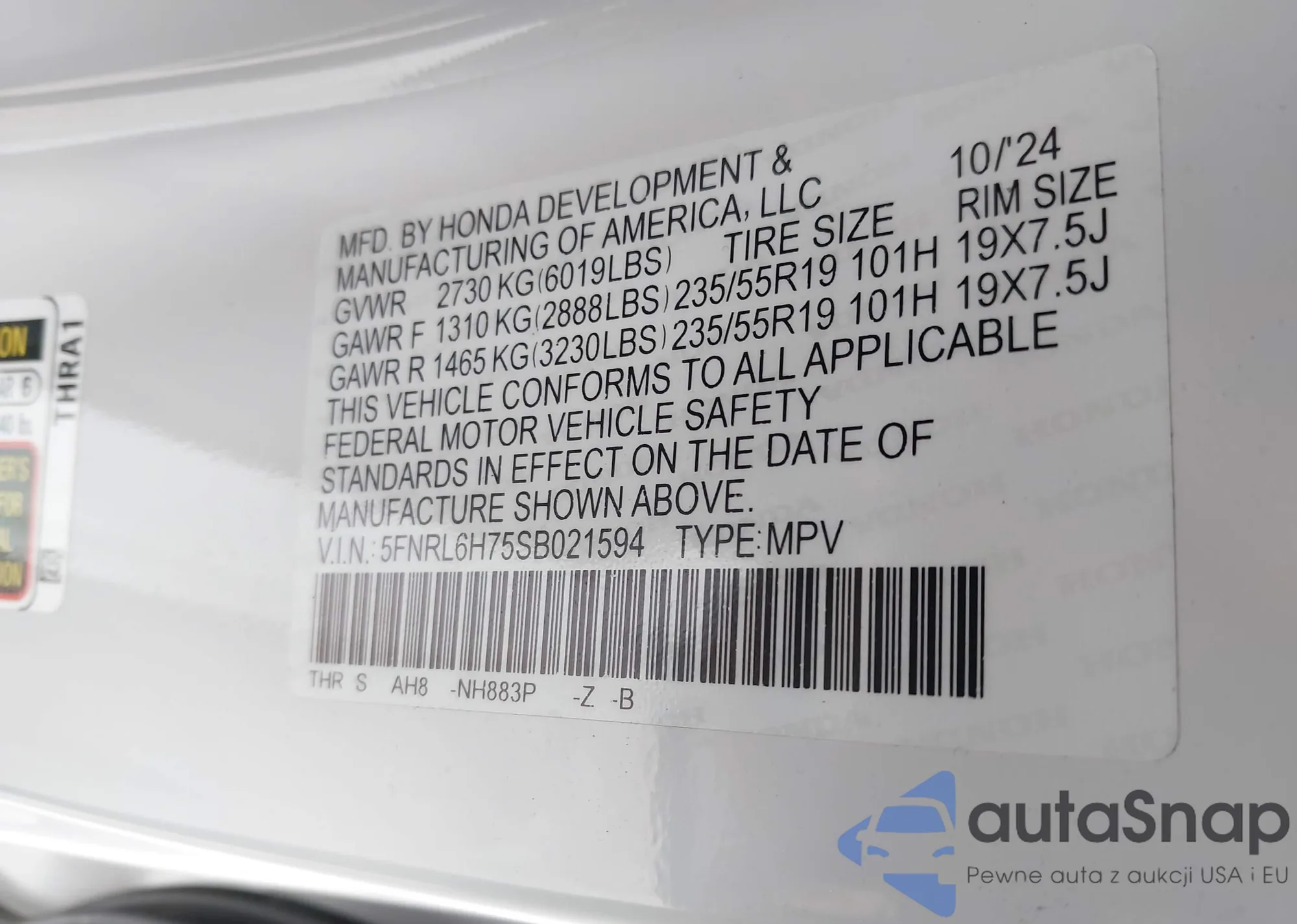 • VIN 5FNRL6H75SB021594