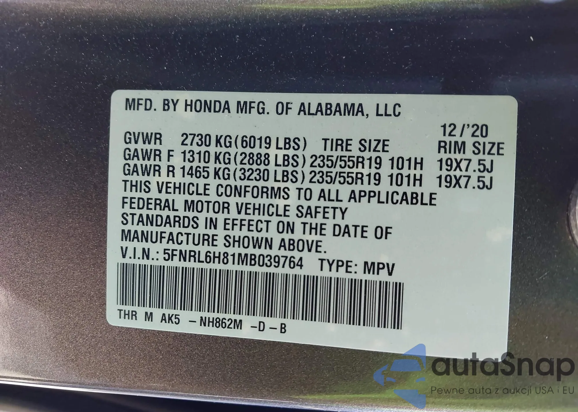 • VIN 5FNRL6H81MB039764