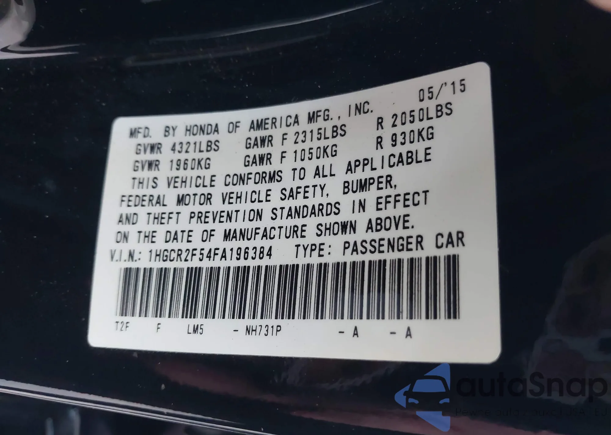 LOT: 44087670 VIN: 1HGCR2F54FA196384