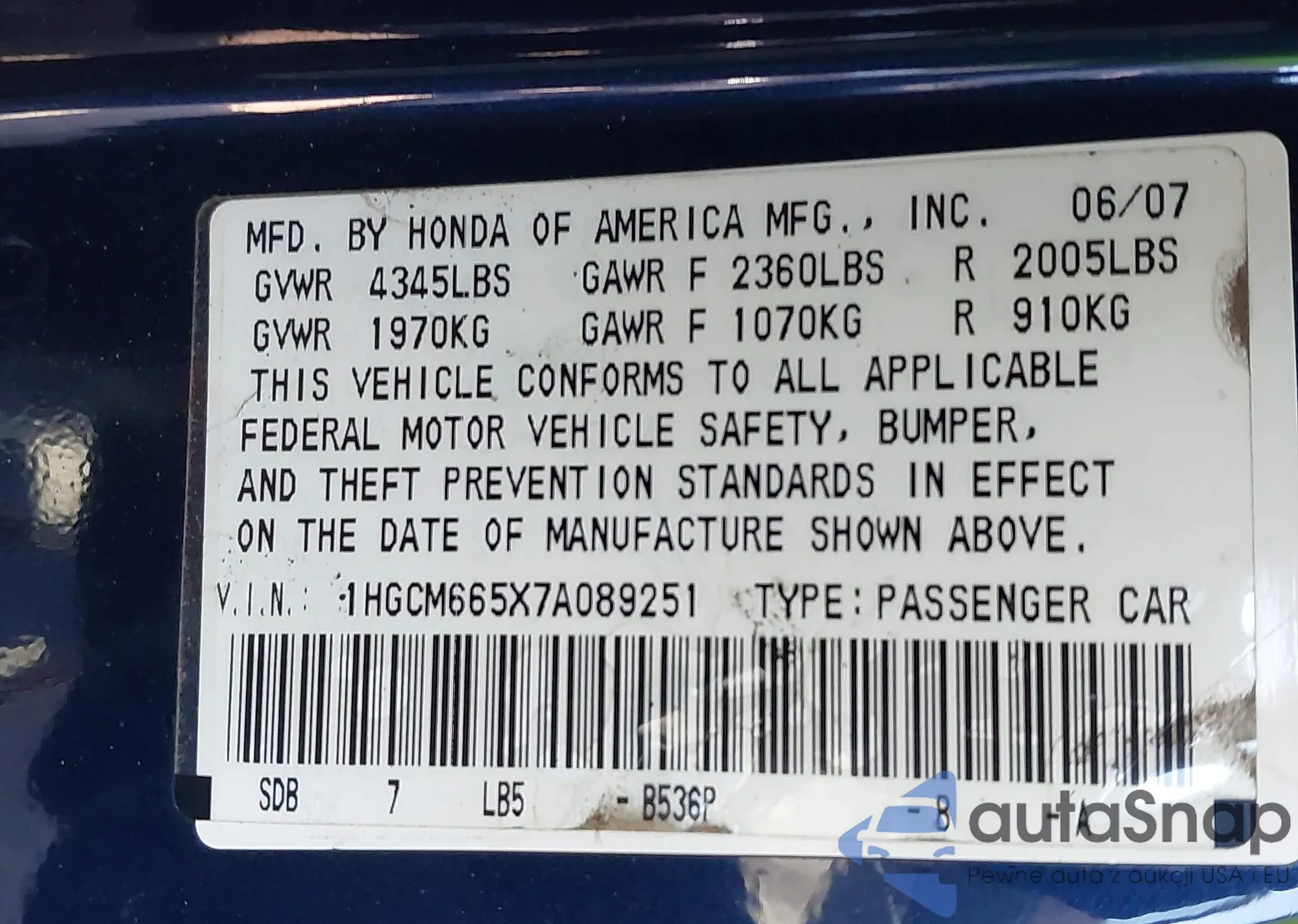 LOT: 44162148 VIN: 1HGCM665X7A089251