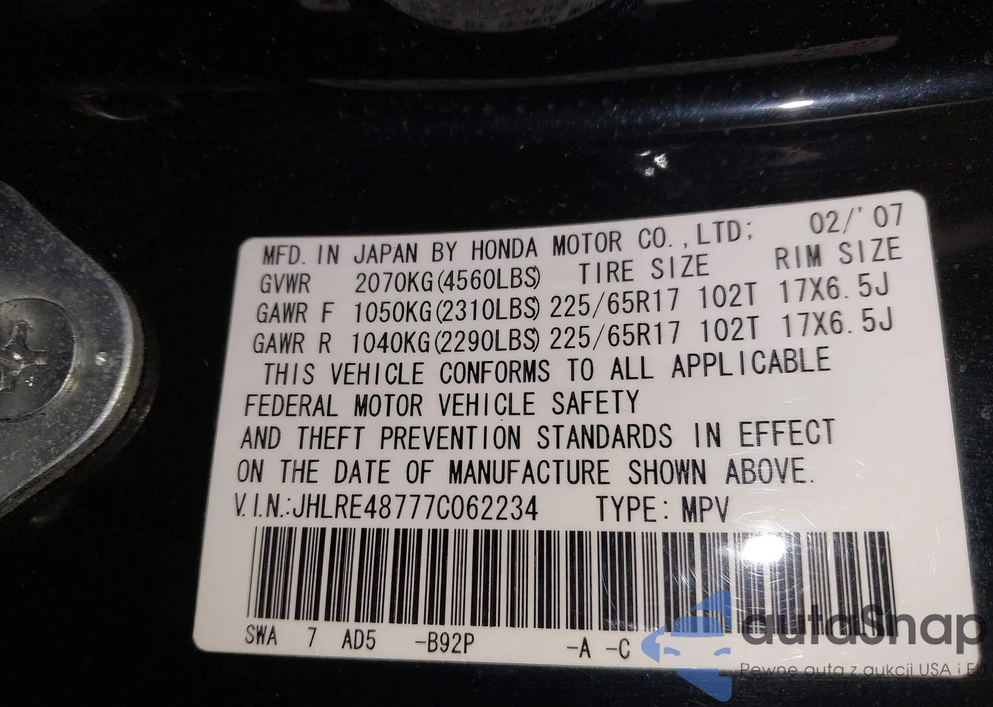 • VIN JHLRE48777C062234