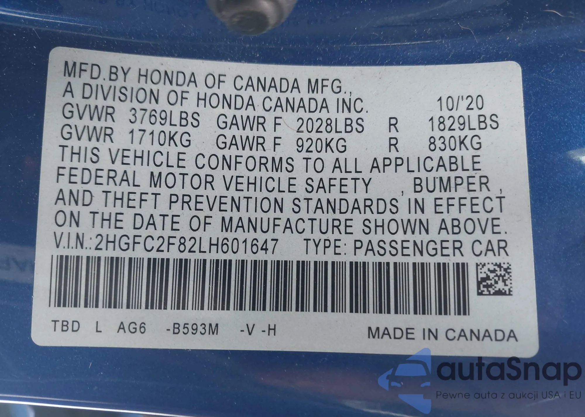 • VIN 2HGFC2F82LH601647
