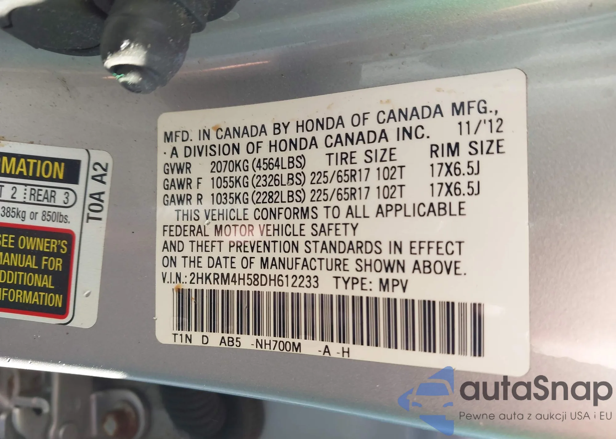 • VIN 2HKRM4H58DH612233