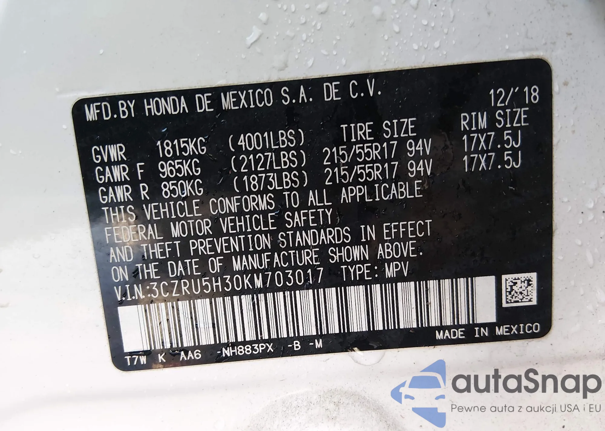 • VIN 3CZRU5H30KM703017