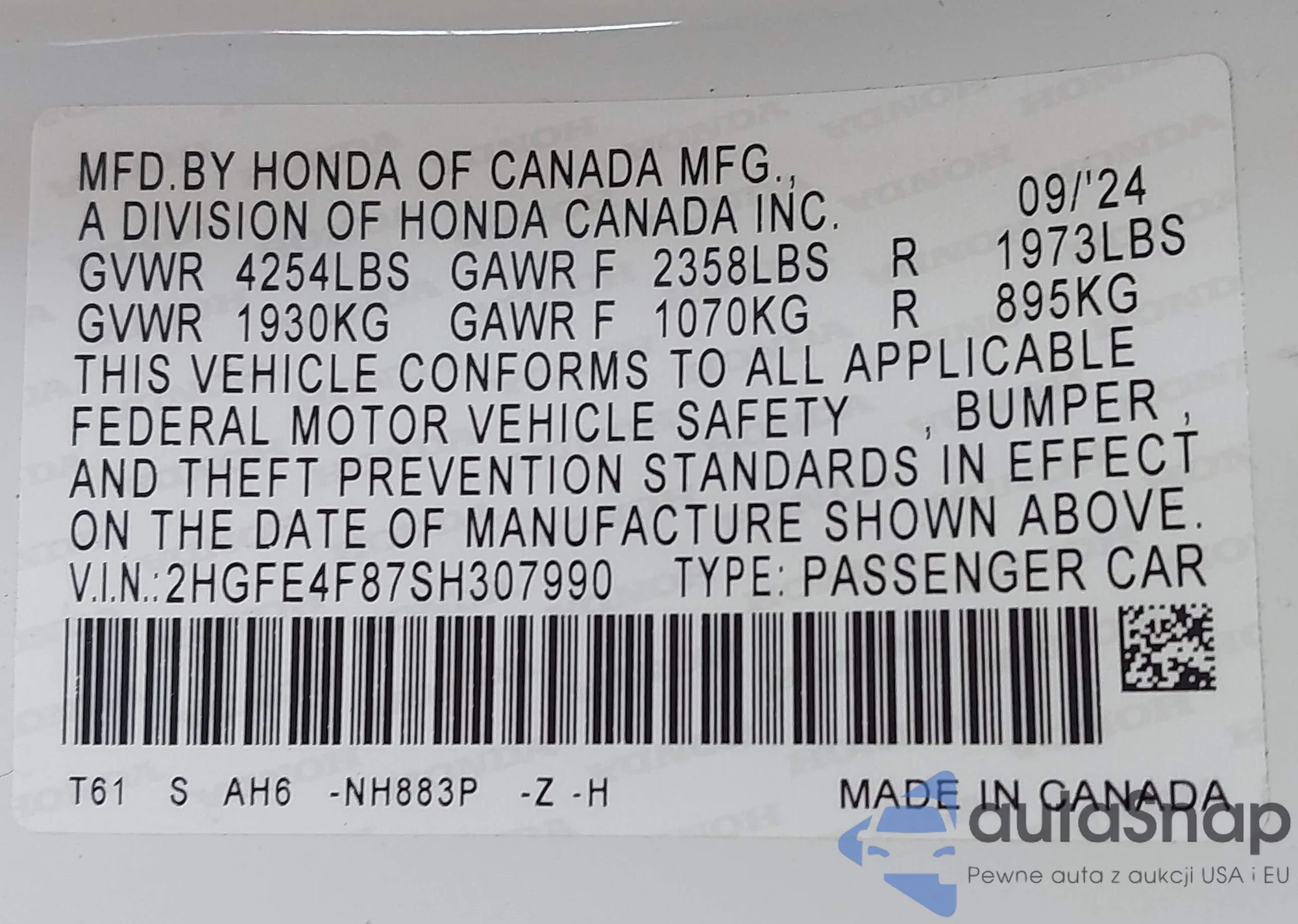 LOT: 43408218 VIN: 2HGFE4F87SH307990