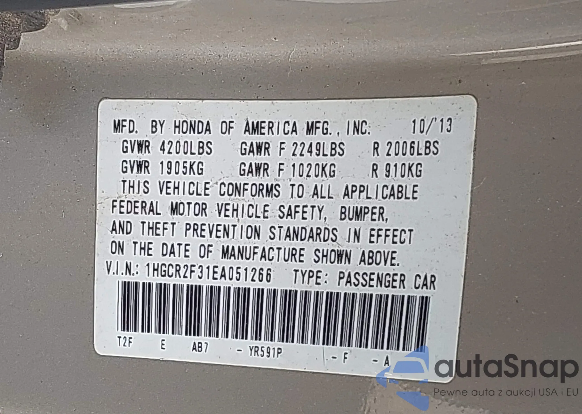 LOT: 43978417 VIN: 1HGCR2F31EA051266