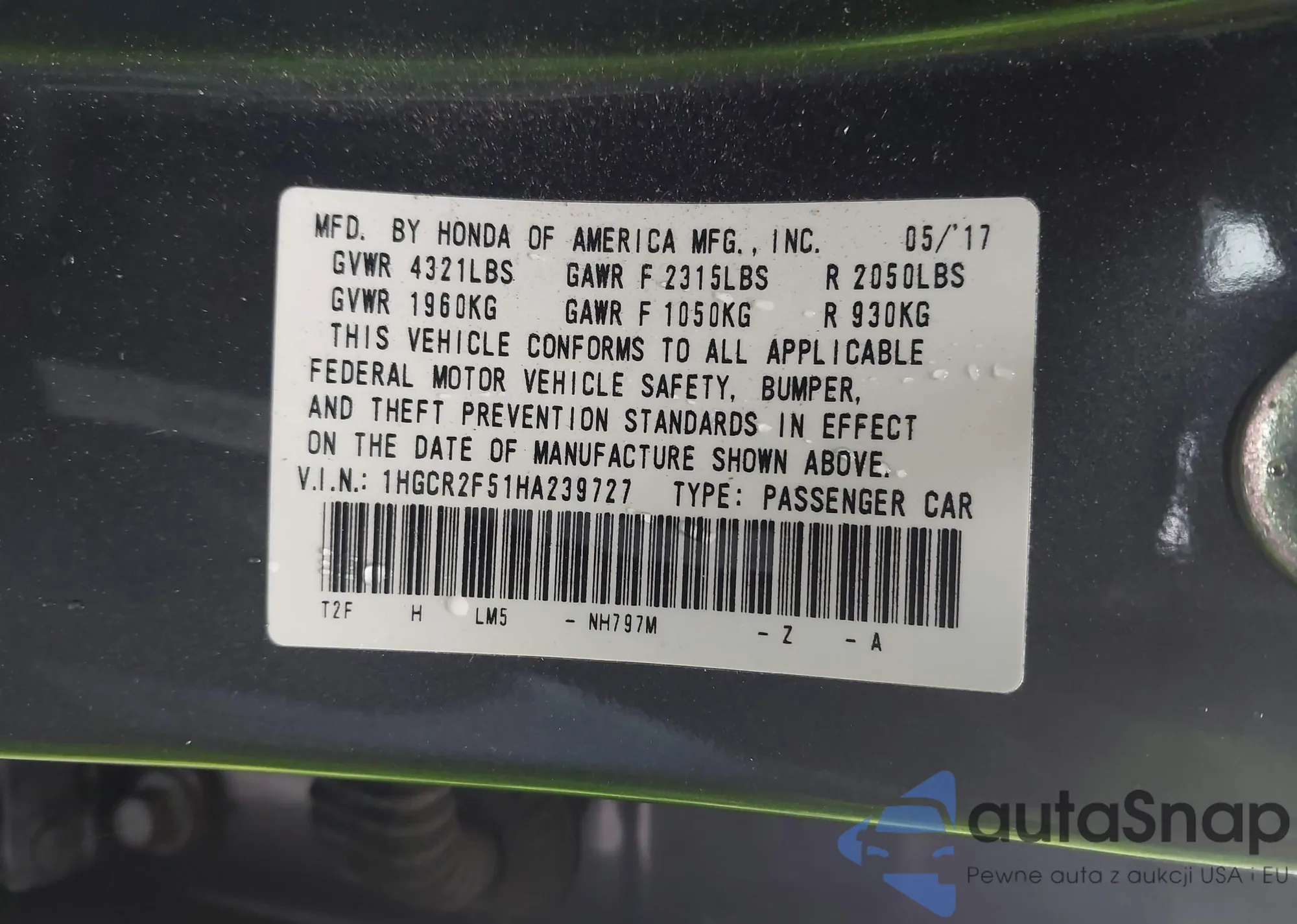 LOT: 44192518 VIN: 1HGCR2F51HA239727