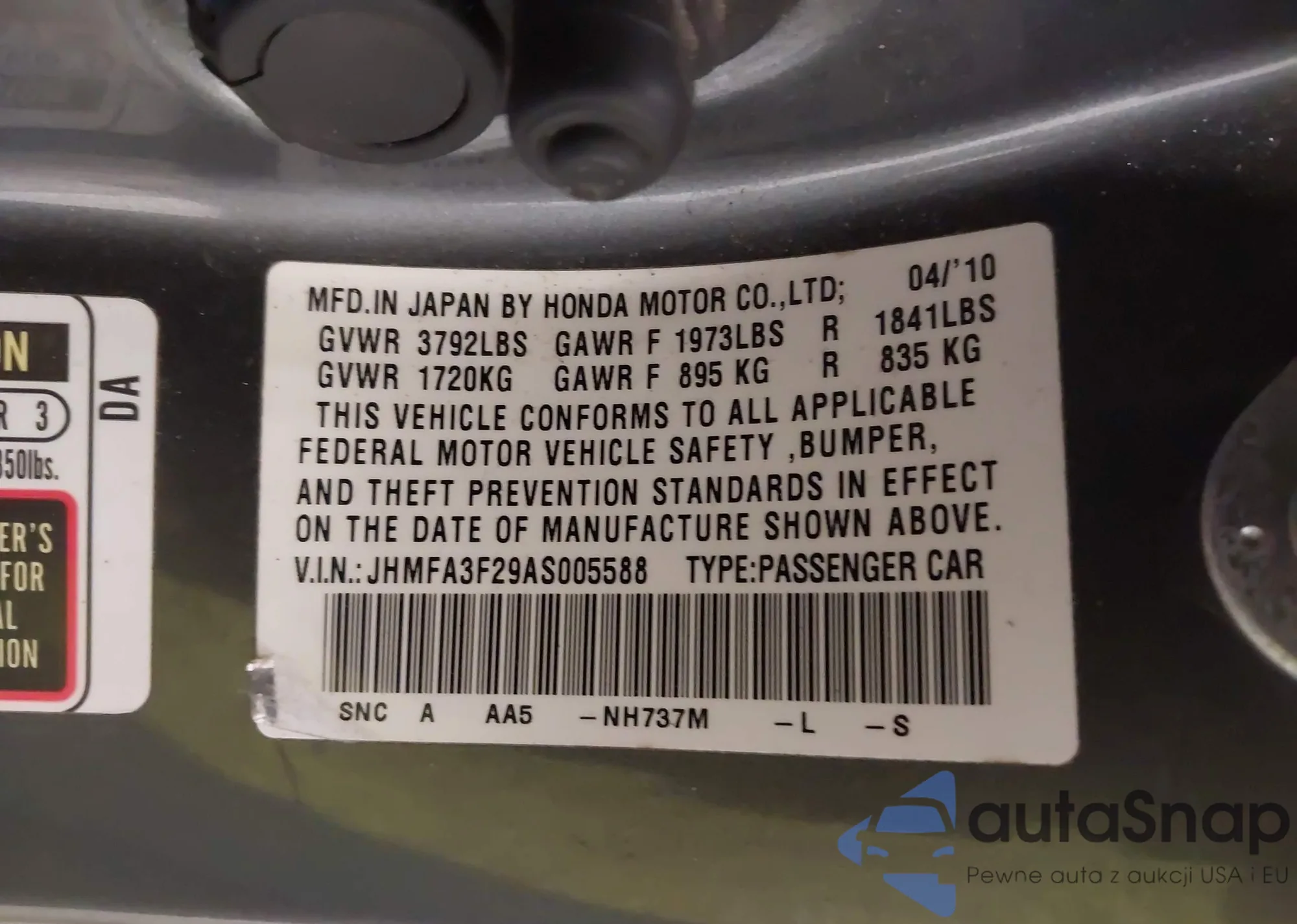 LOT: 44279985 VIN: JHMFA3F29AS005588
