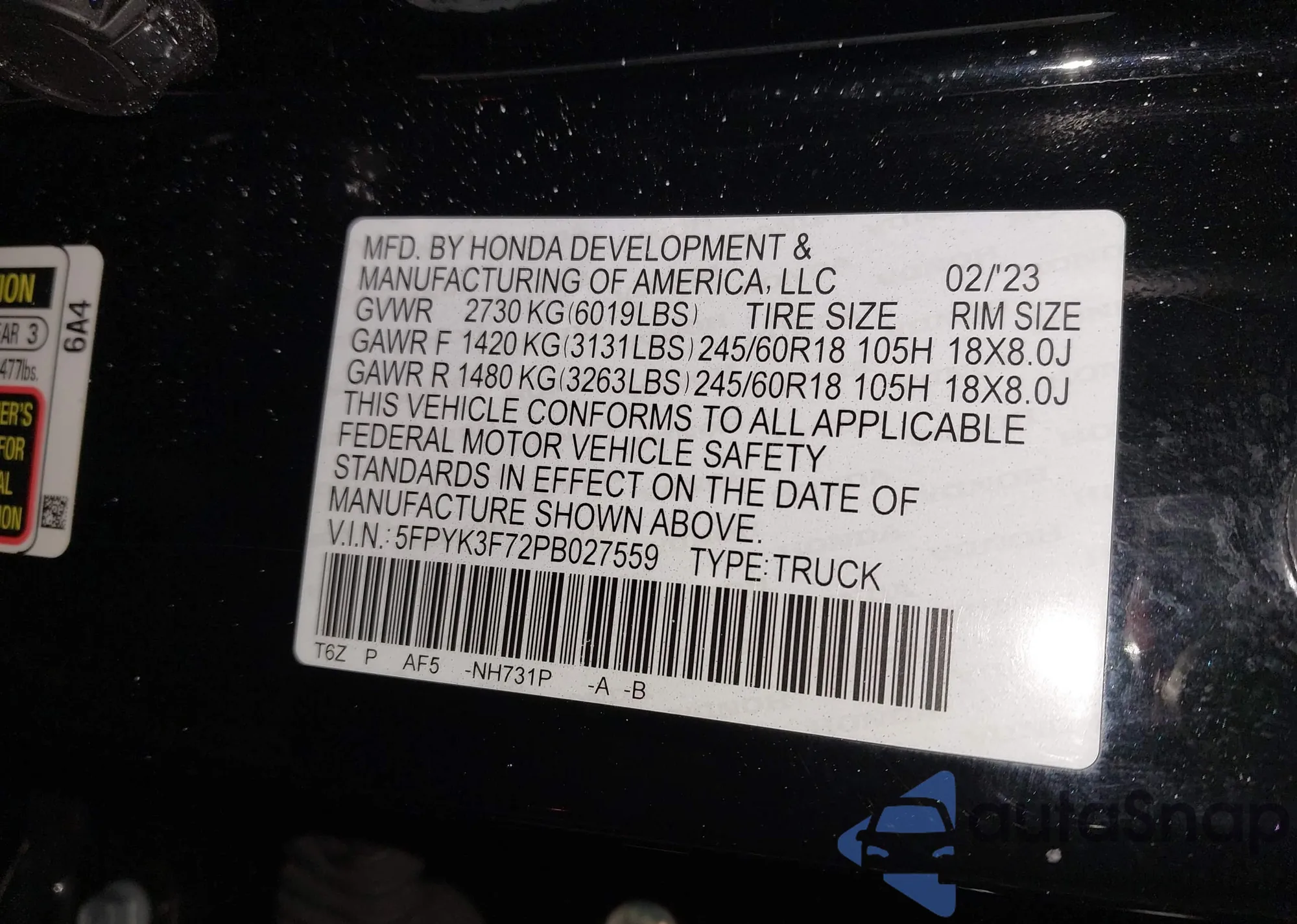• VIN 5FPYK3F72PB027559