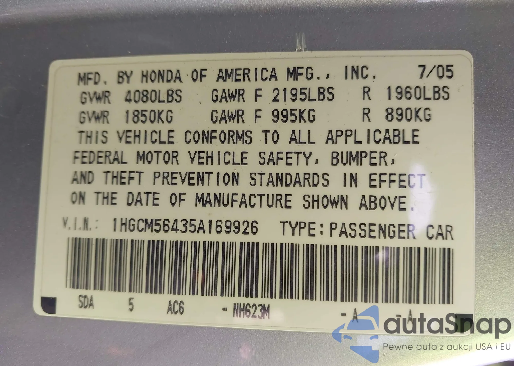 LOT: 44214159 VIN: 1HGCM56435A169926