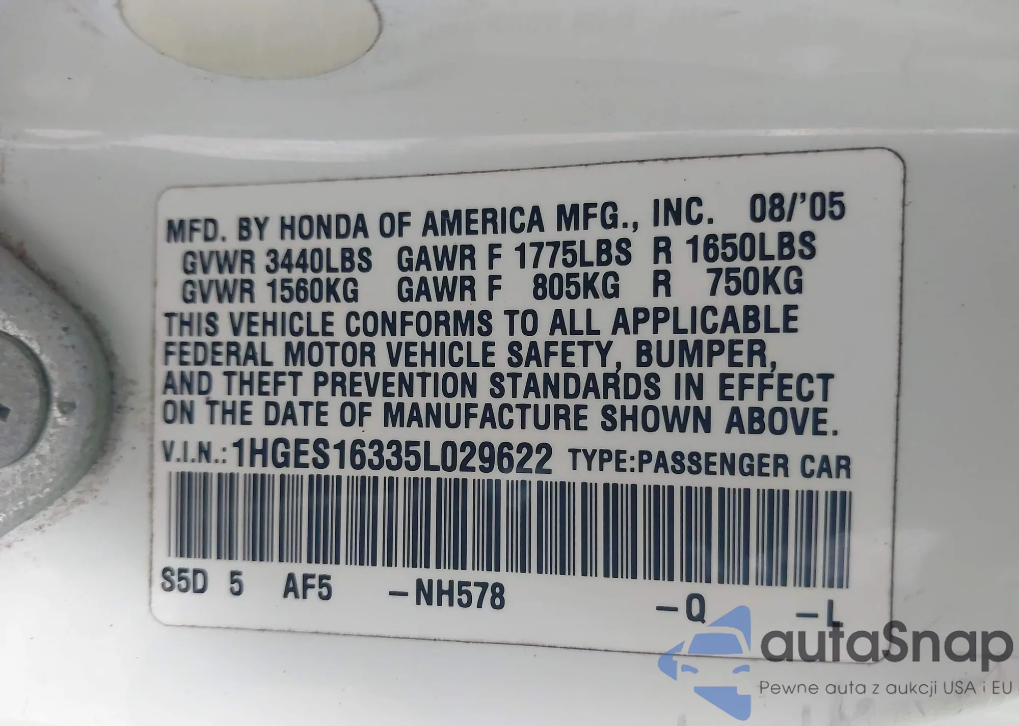 LOT: 44222285 VIN: 1HGES16335L029622