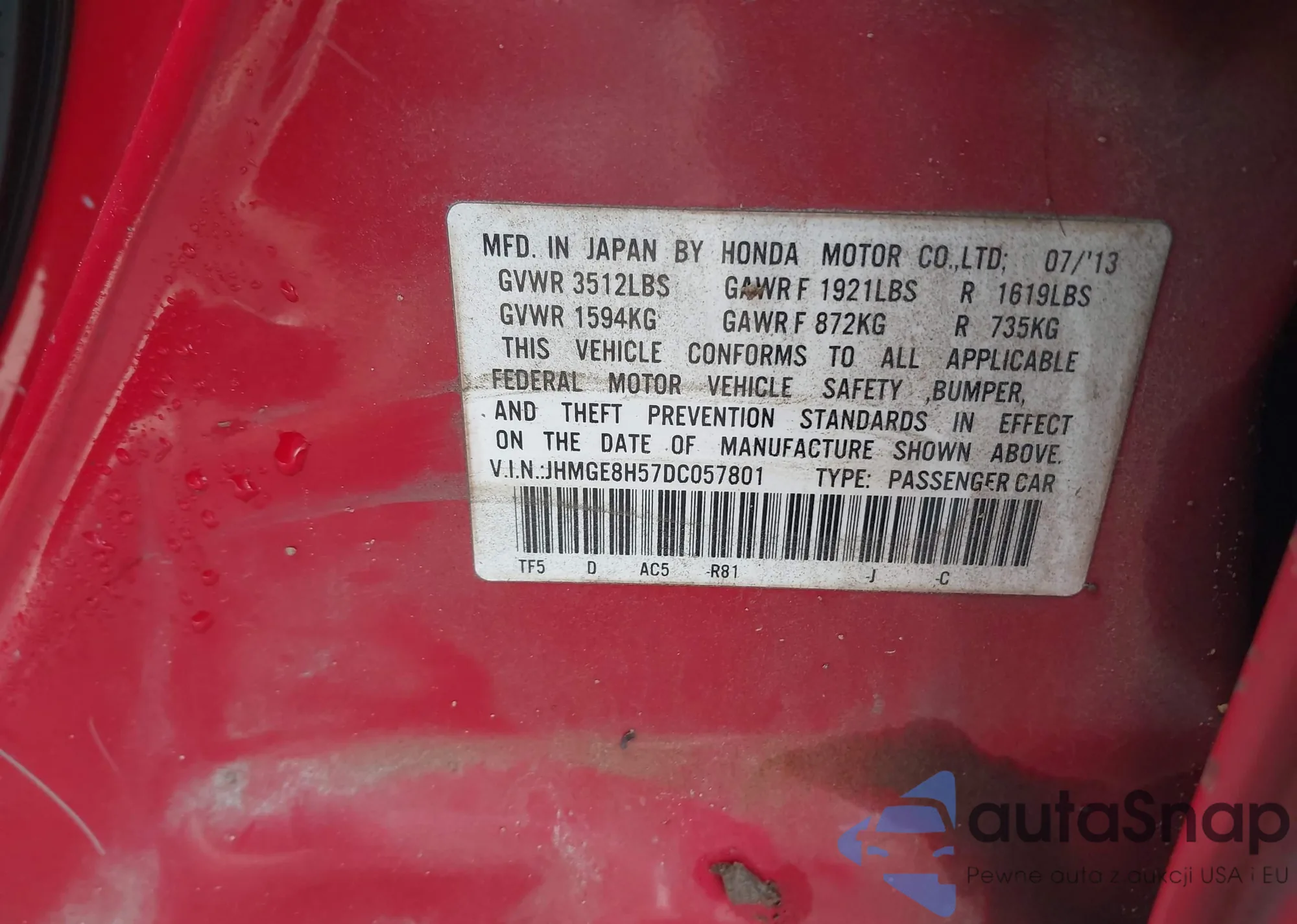 • VIN JHMGE8H57DC057801
