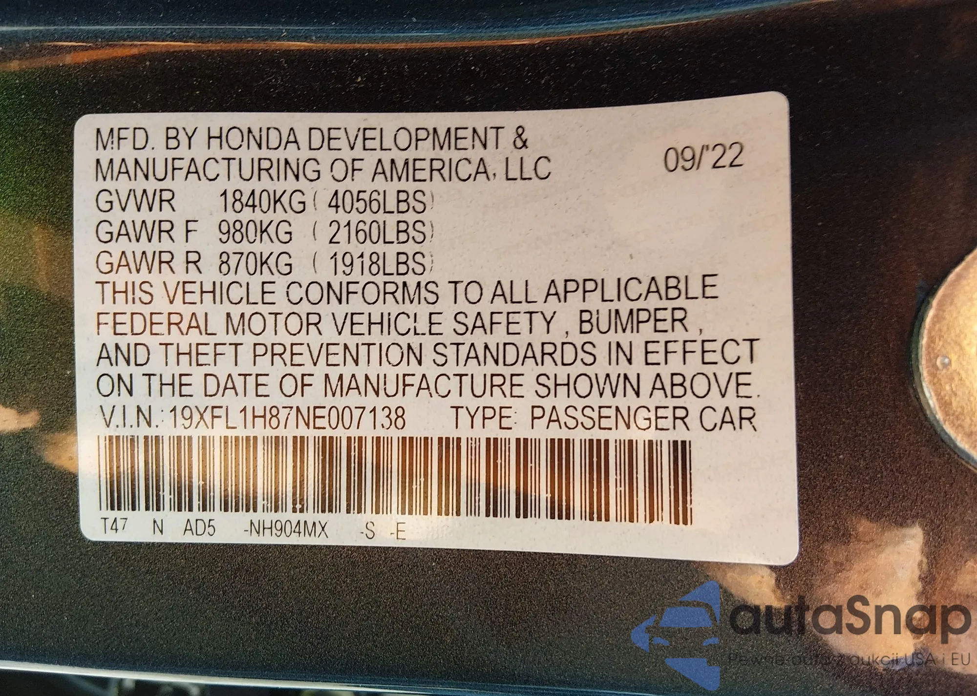 • VIN 19XFL1H87NE007138