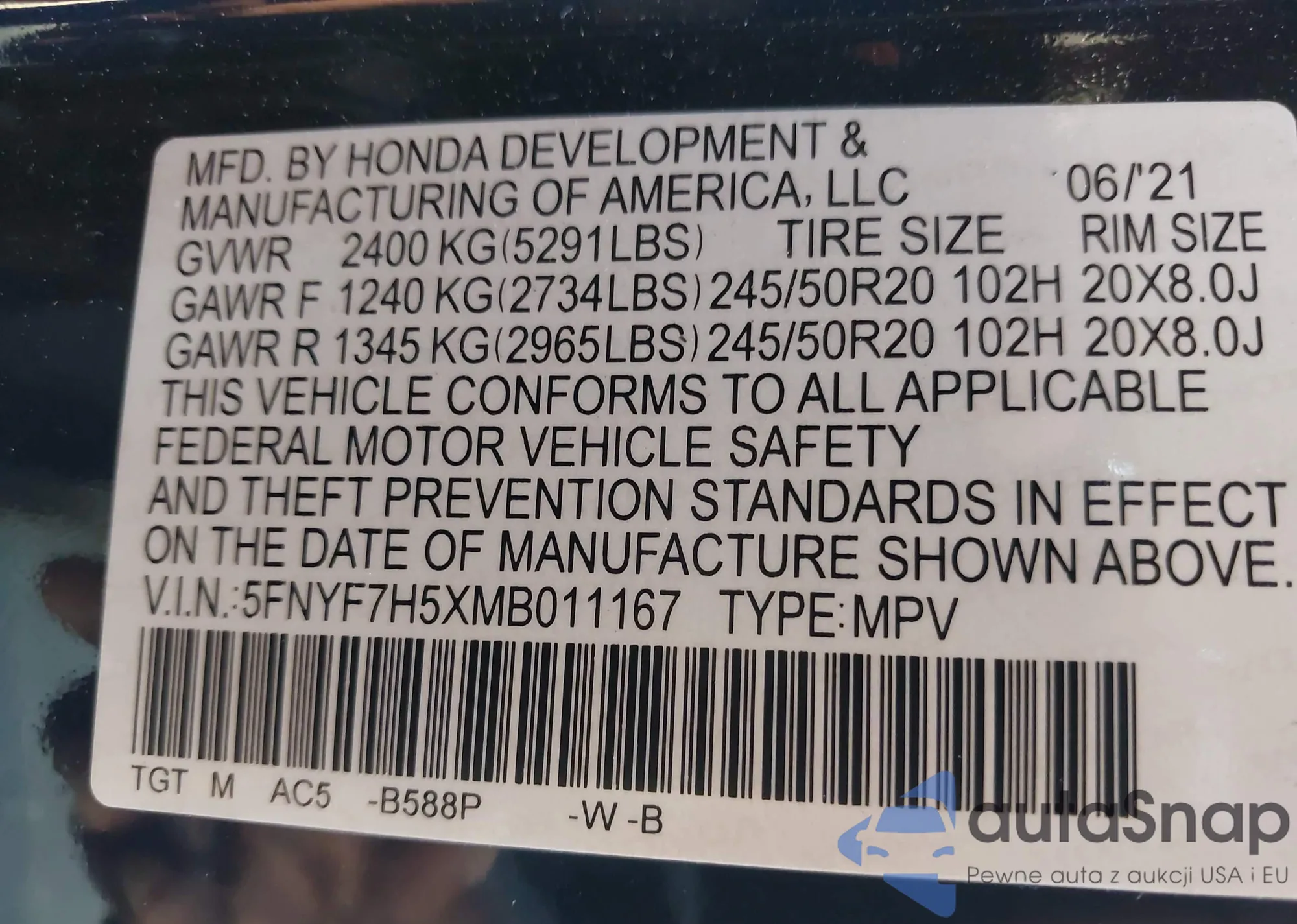 • VIN 5FNYF7H5XMB011167