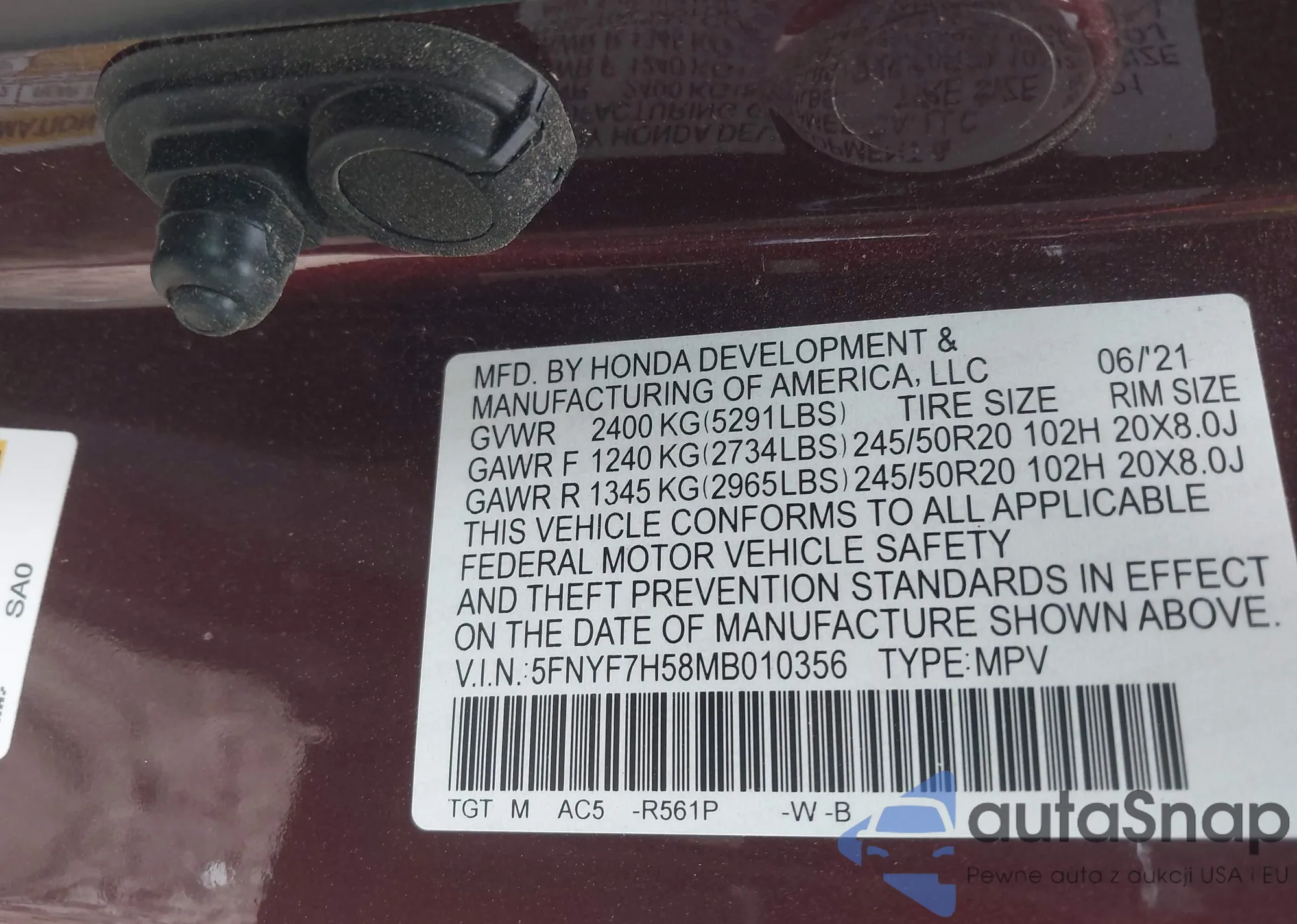 • VIN 5FNYF7H58MB010356