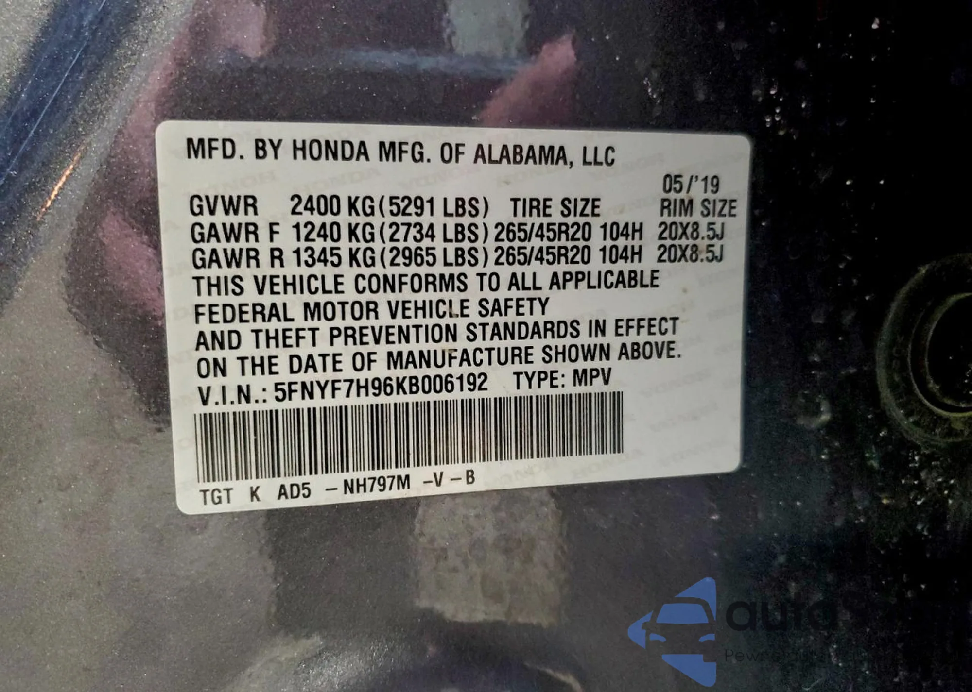 LOT: 94658635 VIN: 5FNYF7H96KB006192