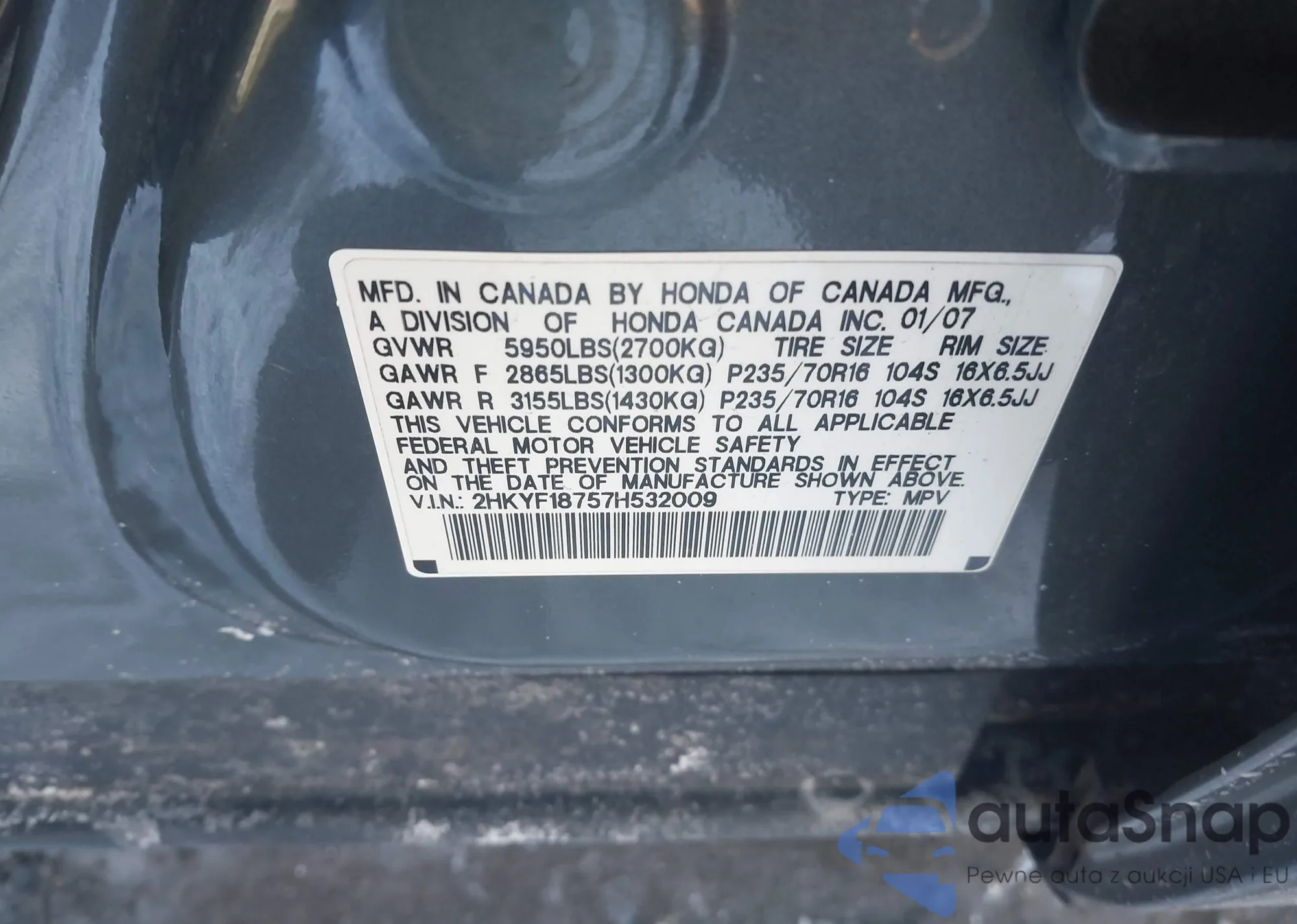 • VIN 2HKYF18757H532009