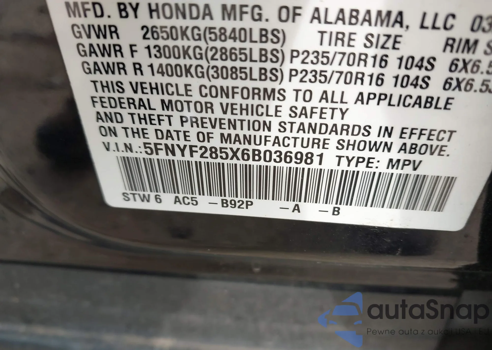 • VIN 5FNYF285X6B036981