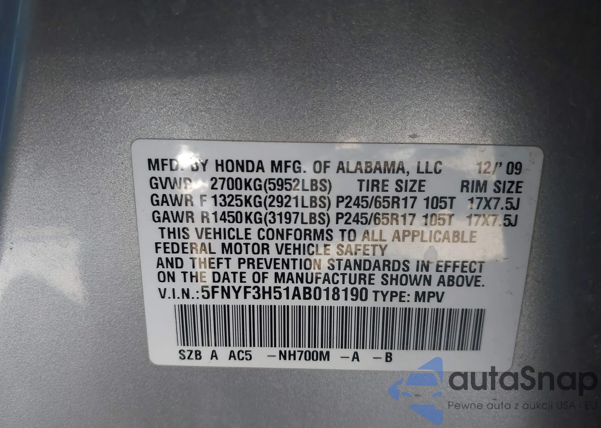 LOT: 43717411 VIN: 5FNYF3H51AB018190