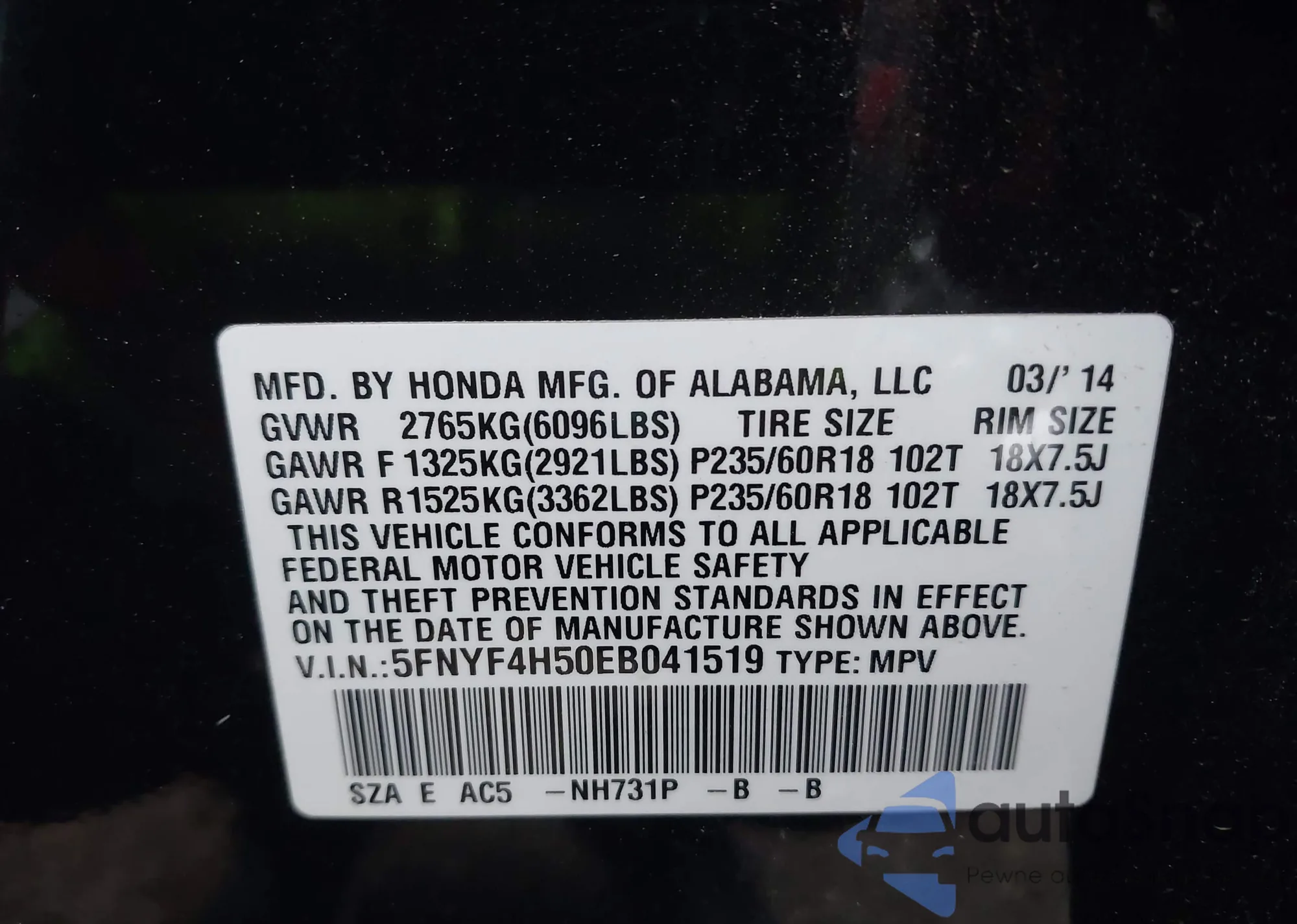• VIN 5FNYF4H50EB041519