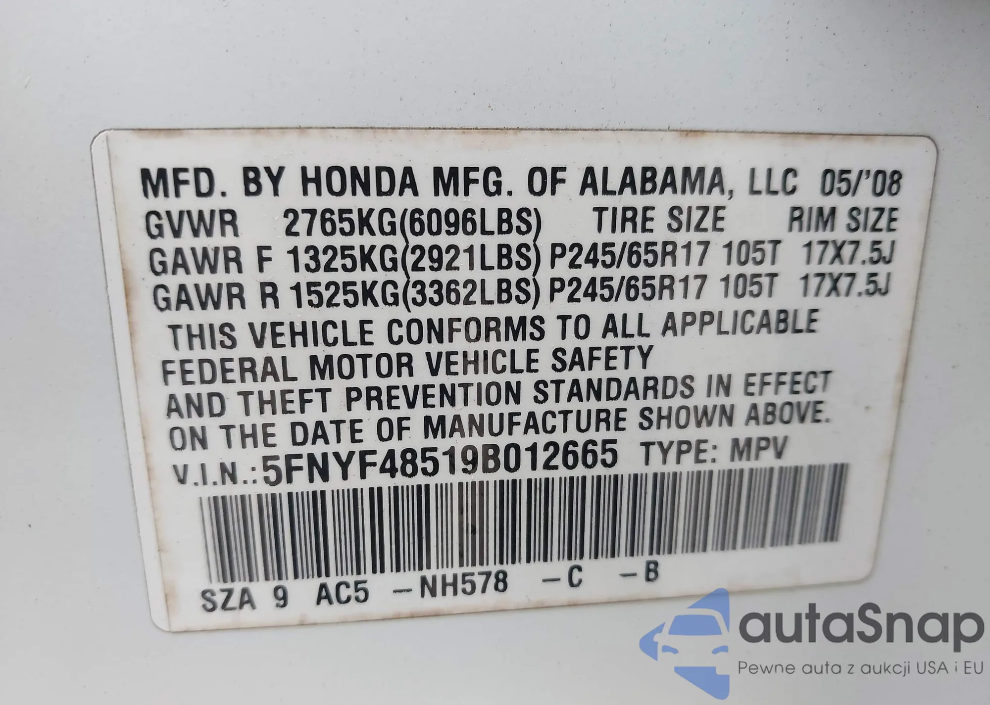 LOT: 43895441 VIN: 5FNYF48589B042133