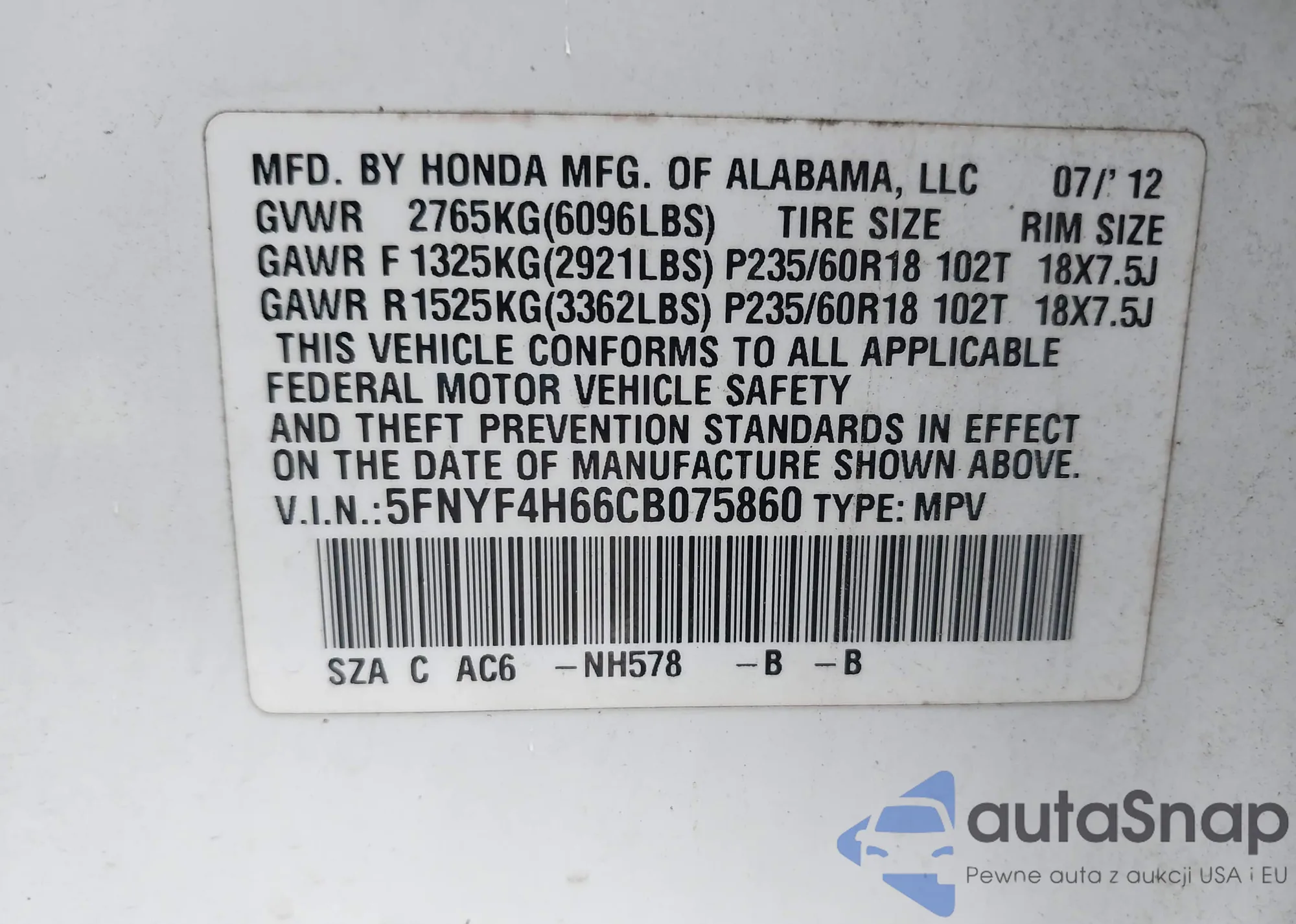 • VIN 5FNYF4H66CB075860