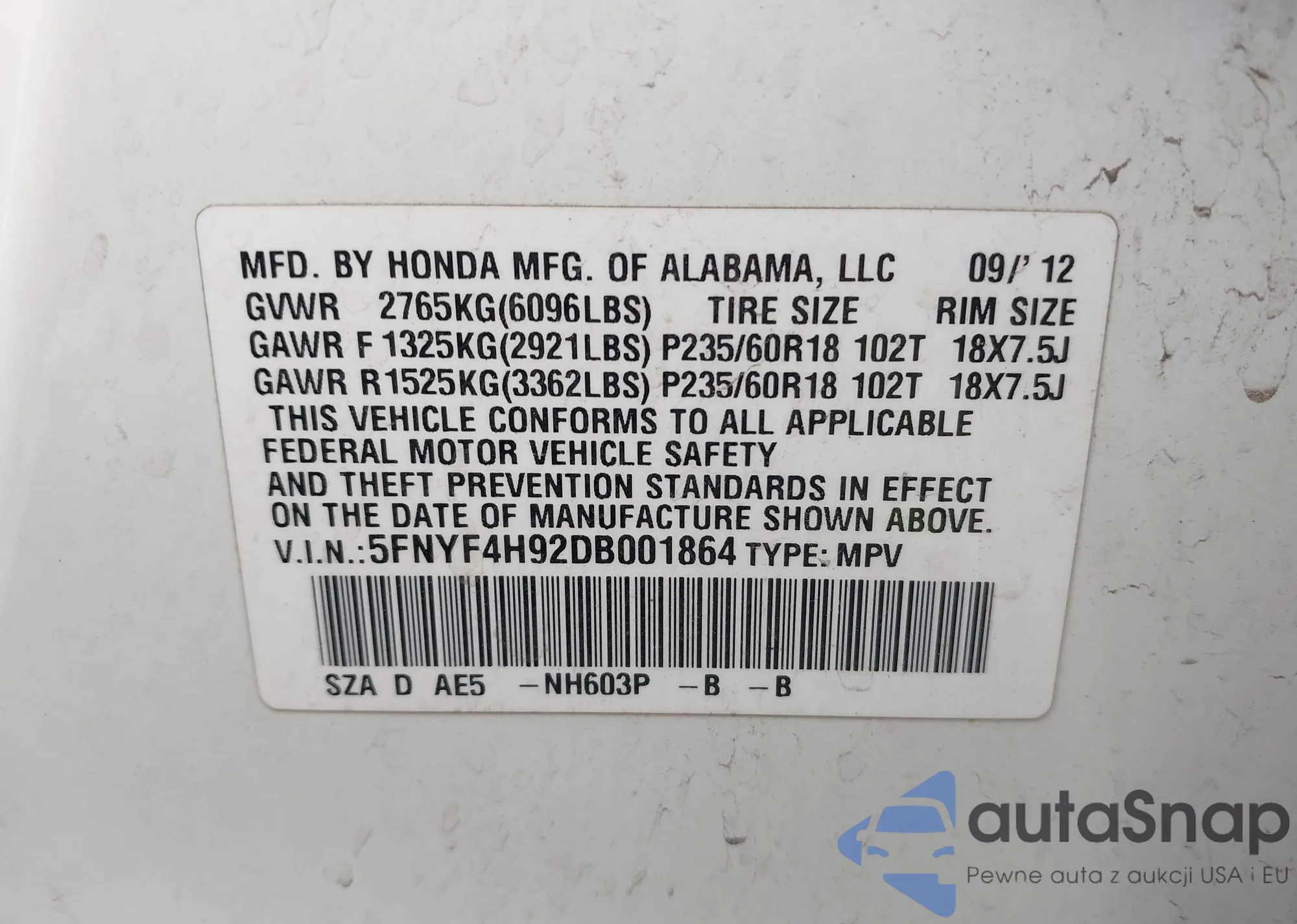 • VIN 5FNYF4H92DB001864