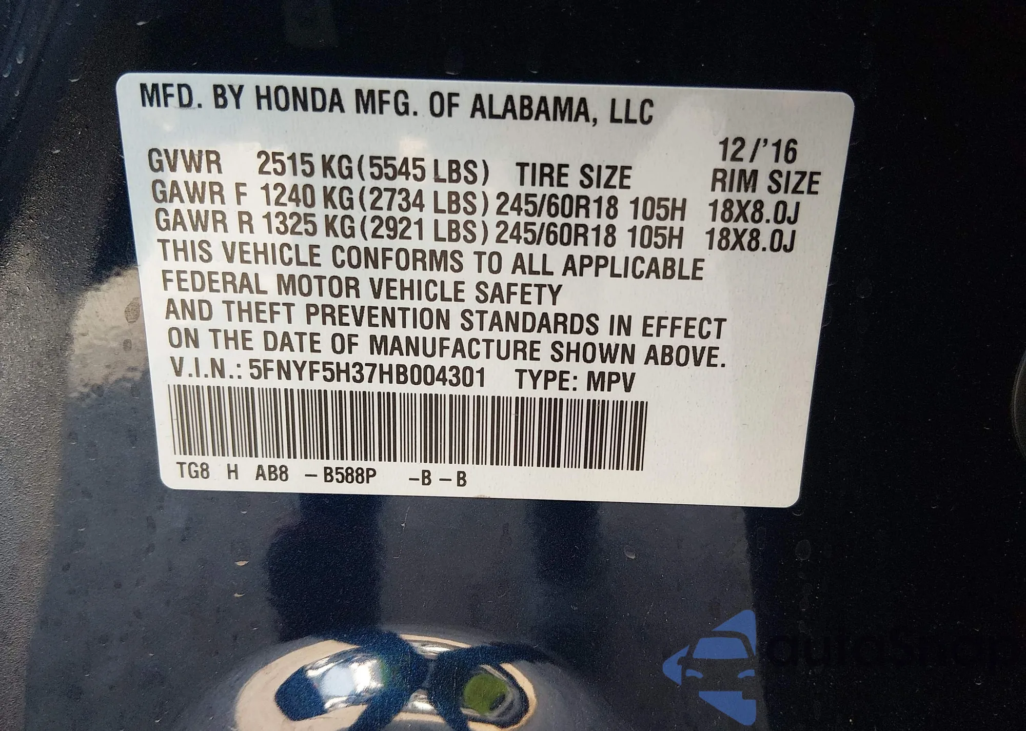• VIN 5FNYF5H37HB004301
