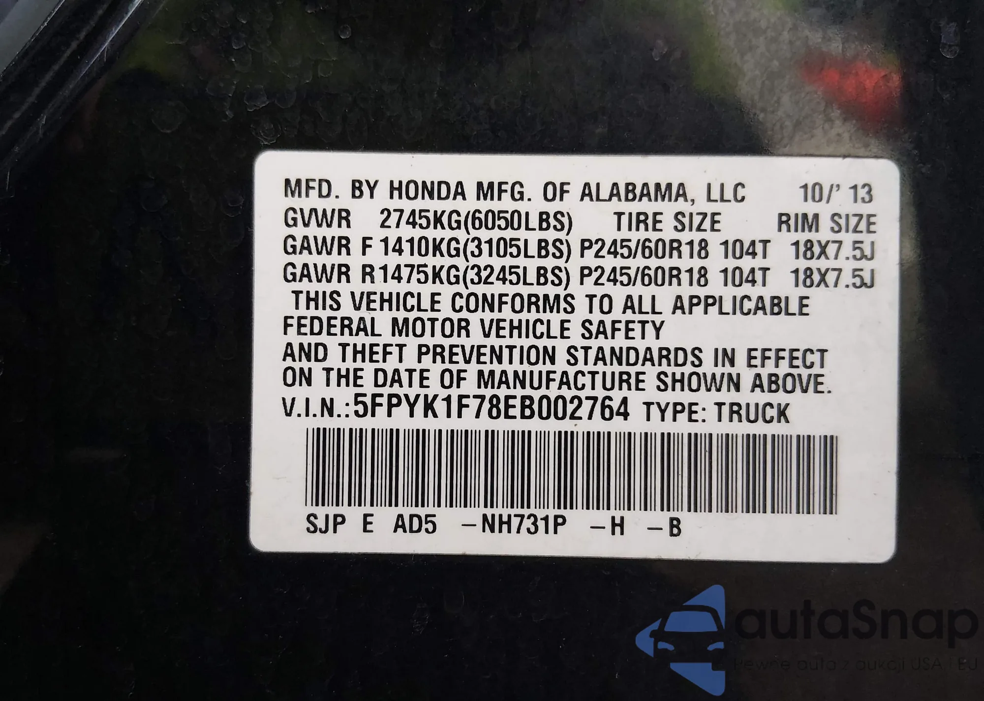 • VIN 5FPYK1F78EB002764