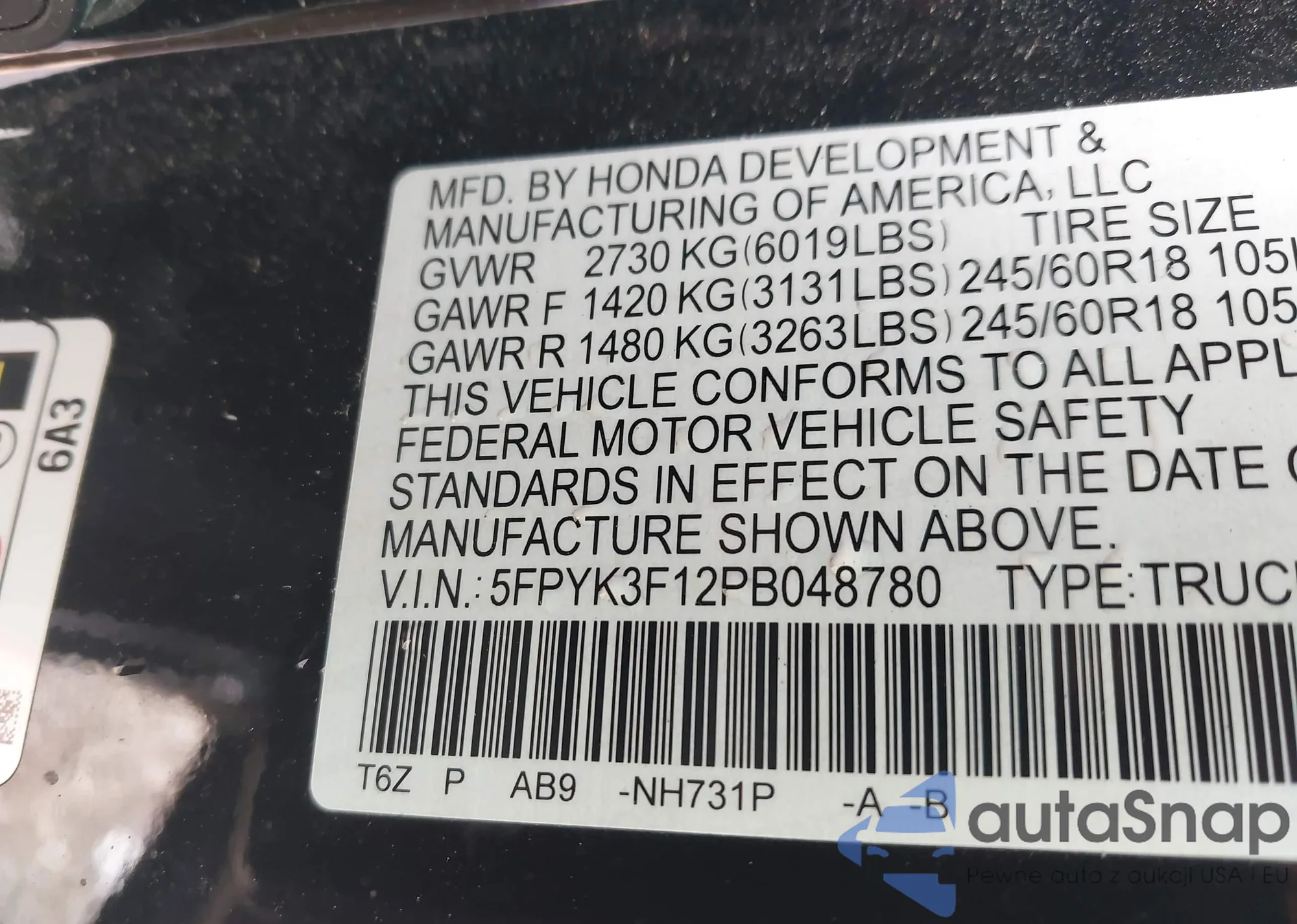 • VIN 5FPYK3F12PB048780