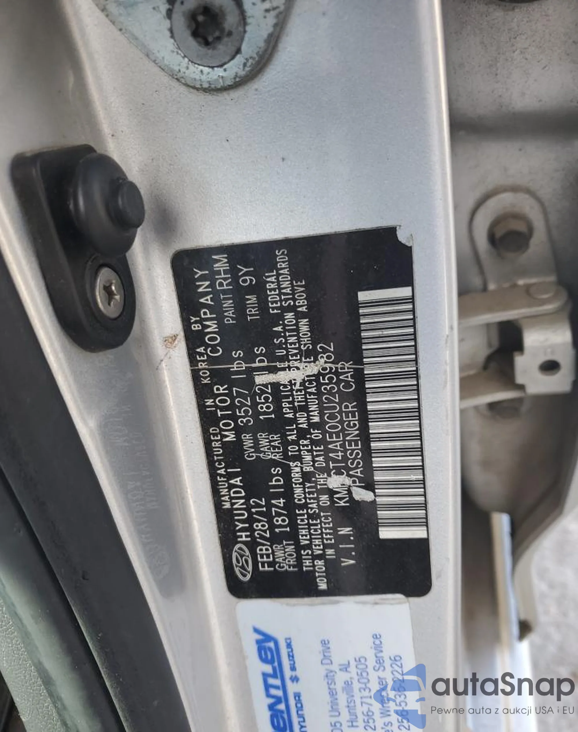 LOT: 92666915 VIN: KMHCT4AE0CU235982