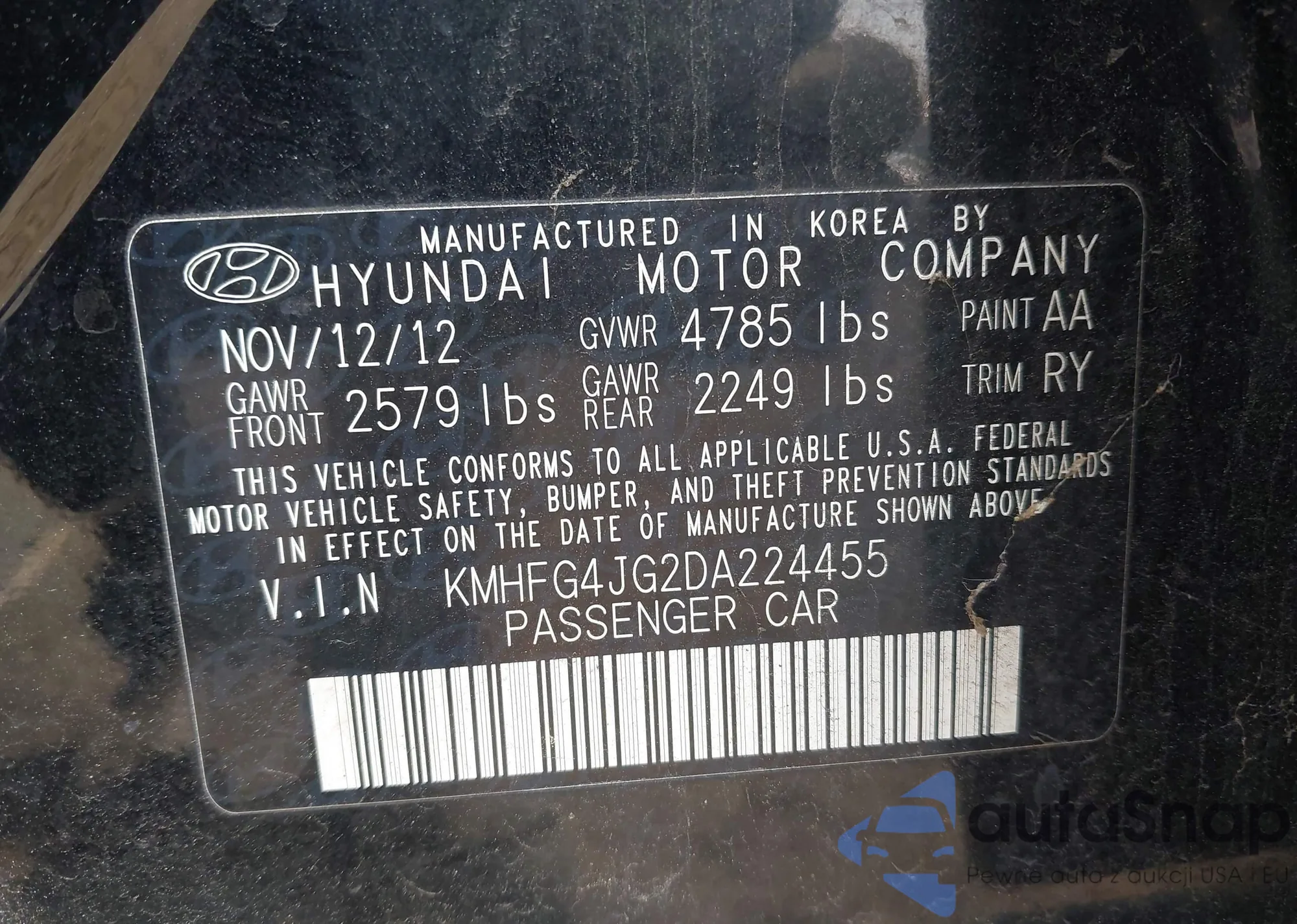 LOT: 42392111 VIN: KMHFG4JG2DA224455
