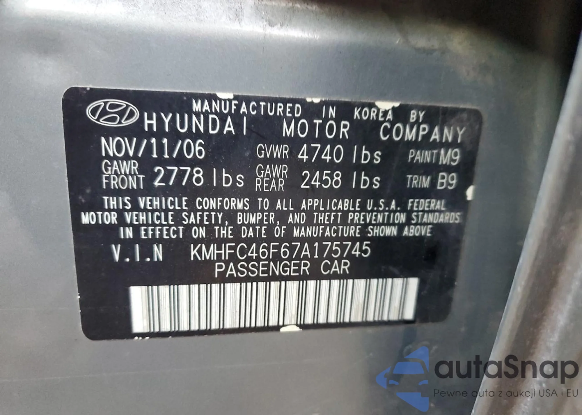 LOT: 91937885 VIN: KMHFC46F67A175745