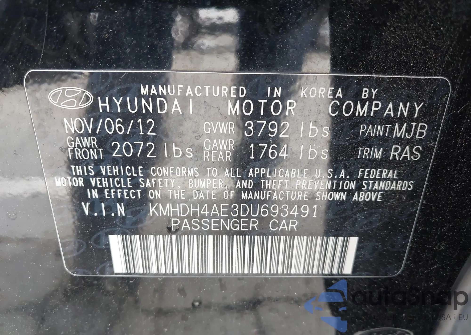 LOT: 42139985 VIN: KMHDH4AE3DU693491