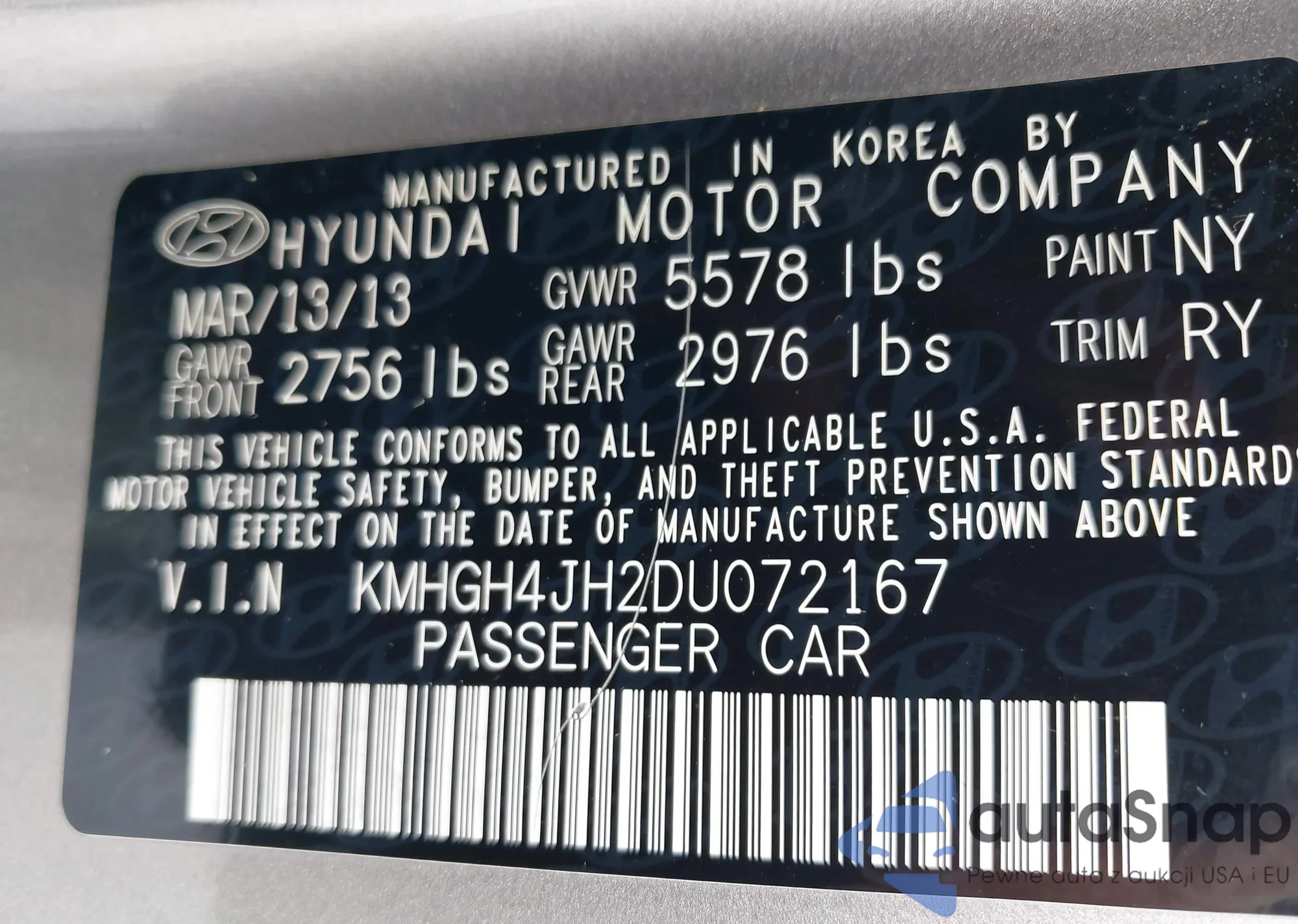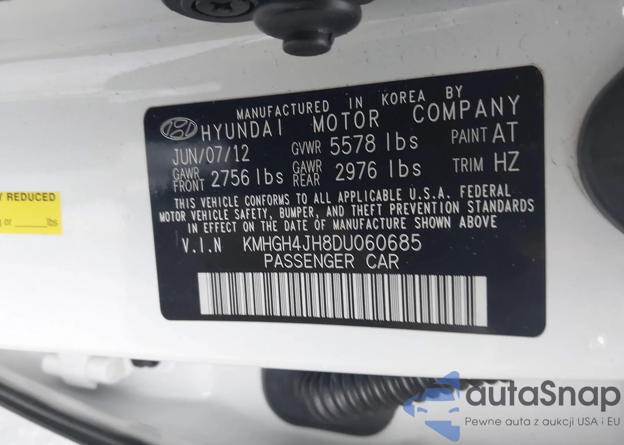 LOT: 44000503 VIN: KMHGH4JH8DU060685