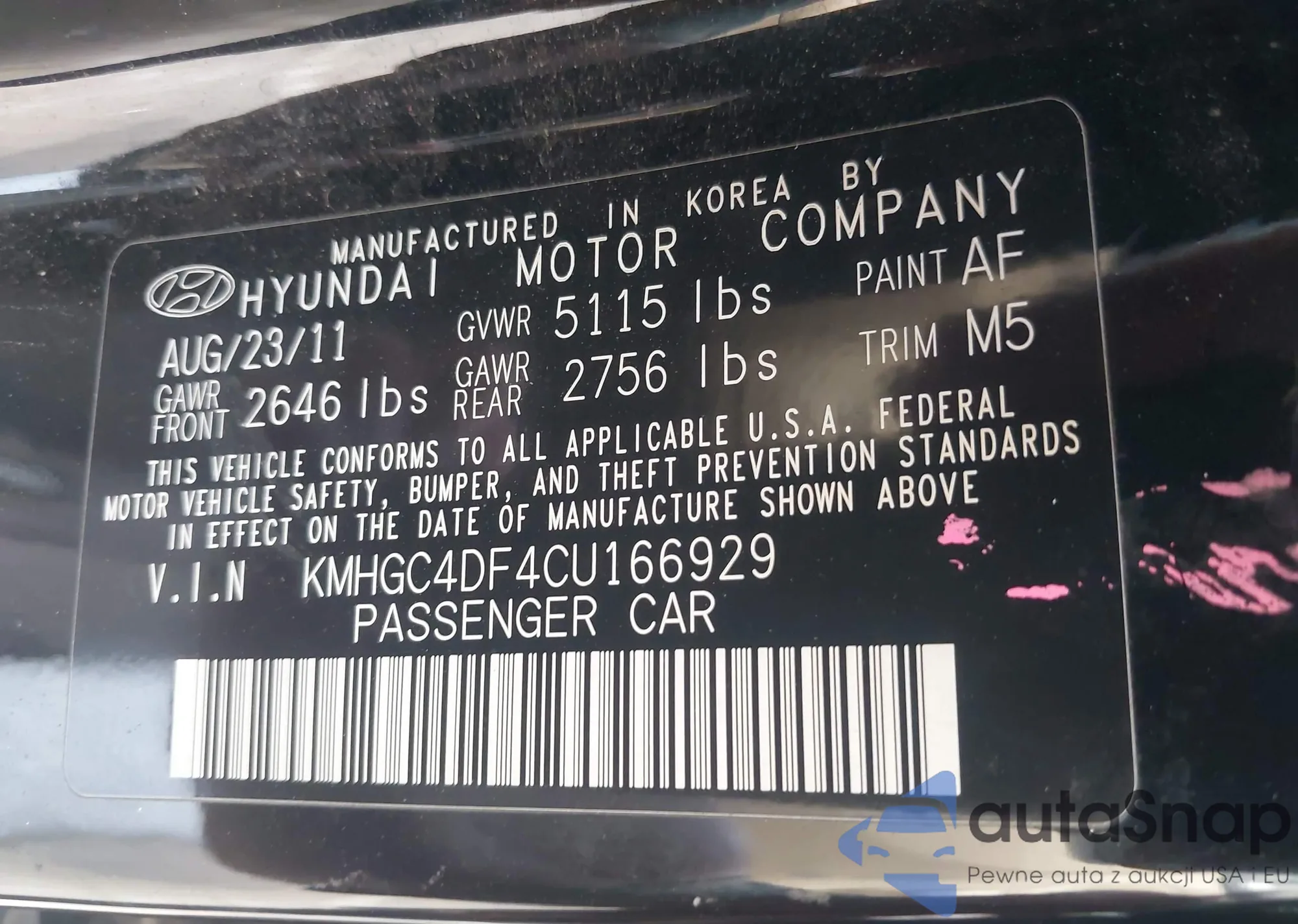 • VIN KMHGC4DF4CU166929