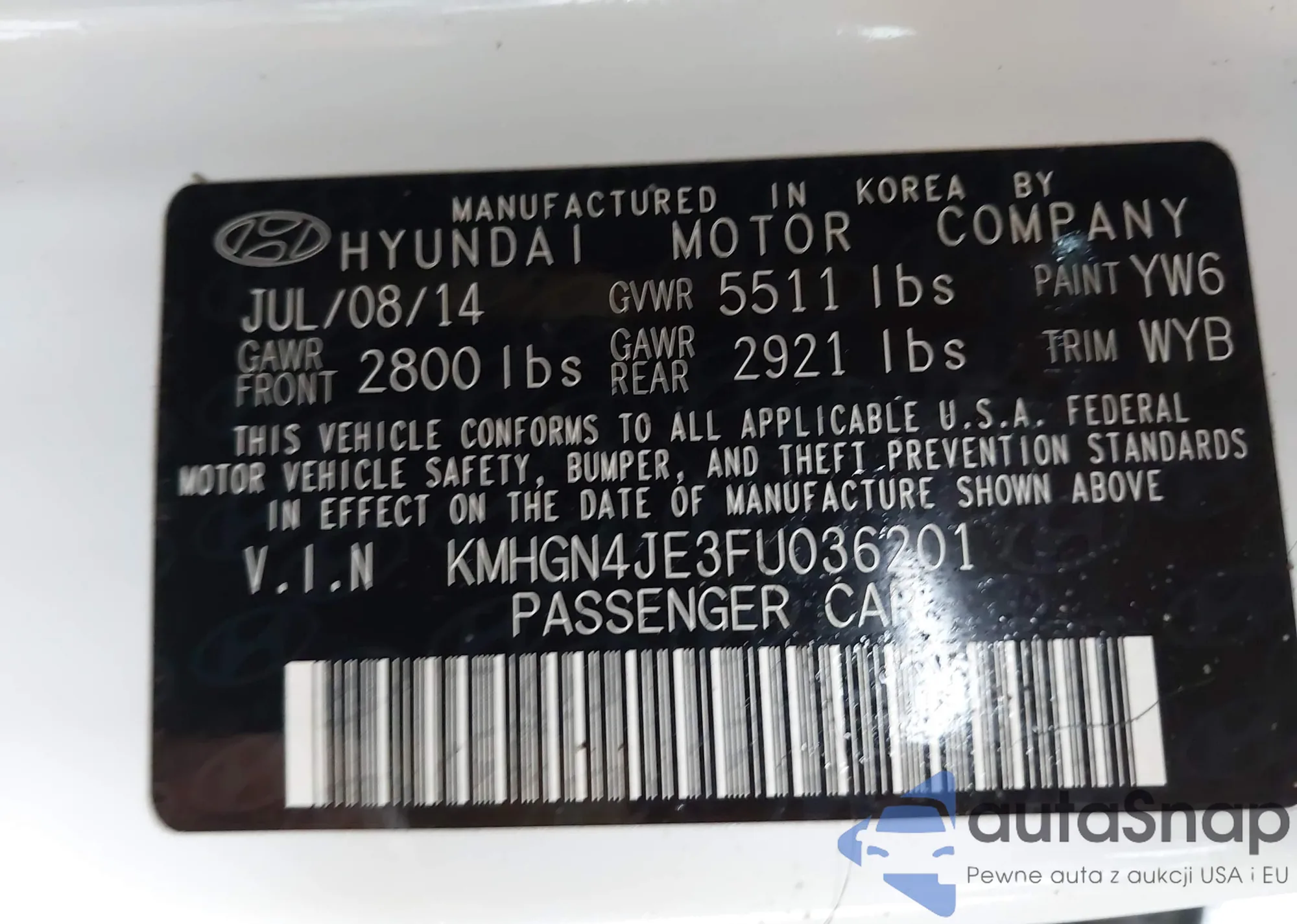 LOT: 44286261 VIN: KMHGN4JE3FU036201