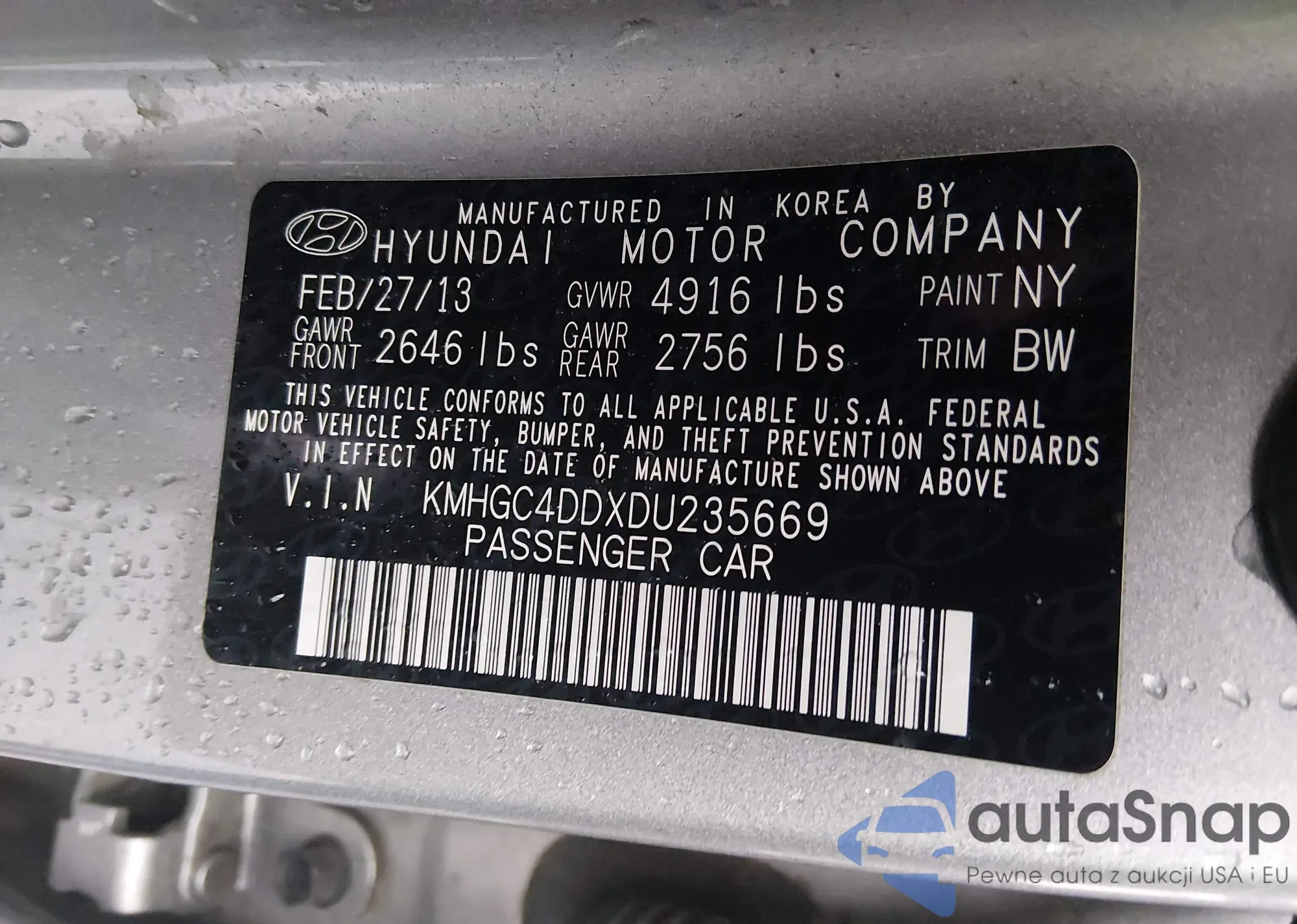 LOT: 44317842 VIN: KMHGC4DDXDU235669